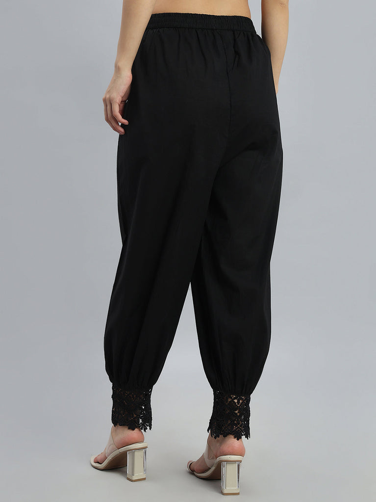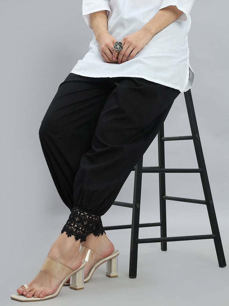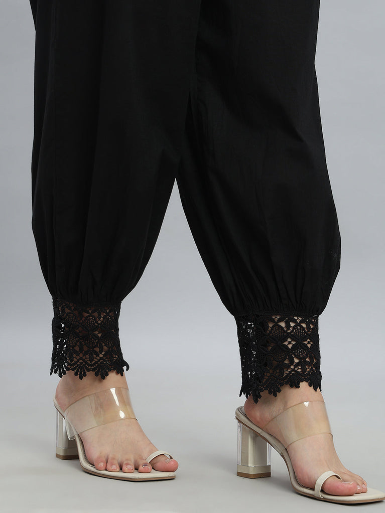 Elevate your ethnic wardrobe with this elegant Black Lace Salwar, crafted from 100% pure cotton for breathable, all-day comfort. Designed in a solid finish with a relaxed fit, it features a comfortable mid-rise waist and an ankle-length silhouette. The highlight of this salwar is the delicate embroidery at the hem, enhanced with lace detailing for a refined ethnic touch. Finished with a soft elastic waistband, it pairs effortlessly with kurtas and tunics for everyday and festive wear.