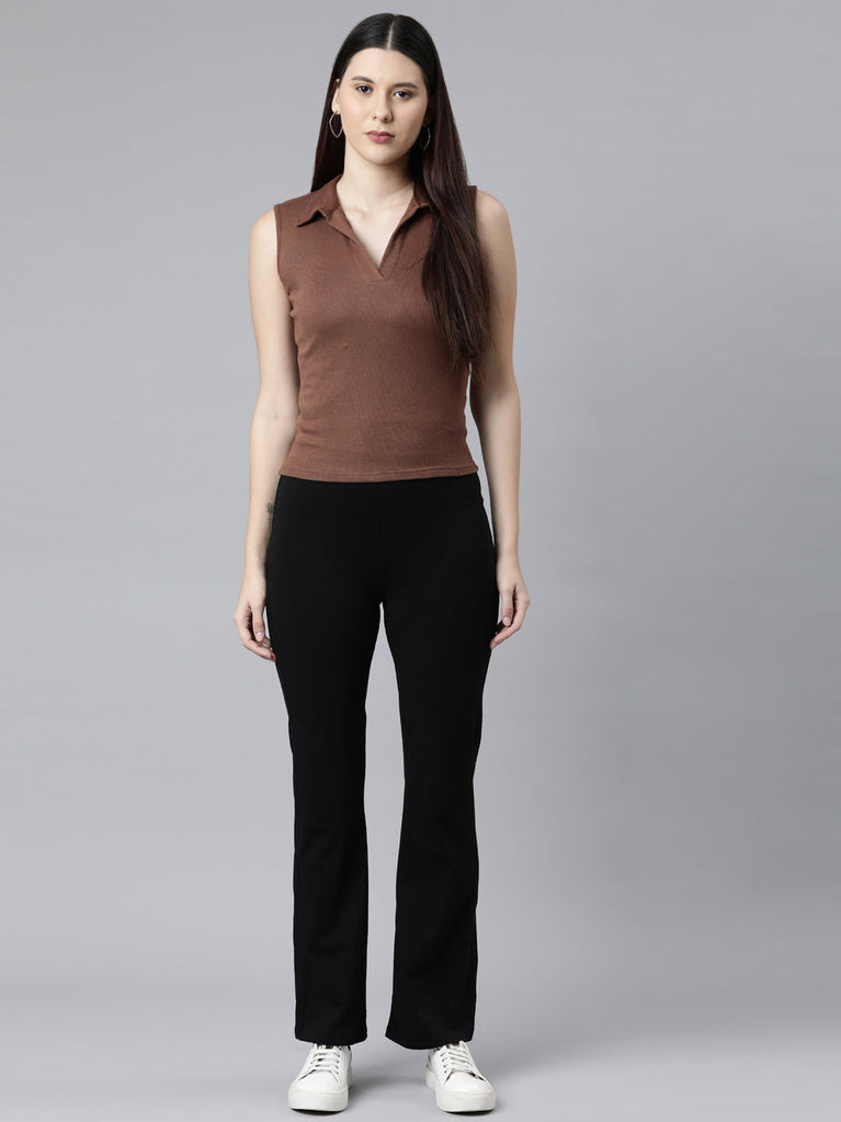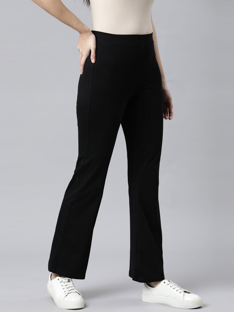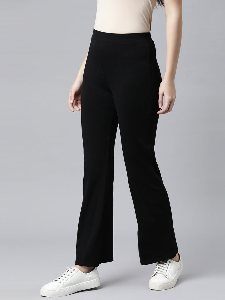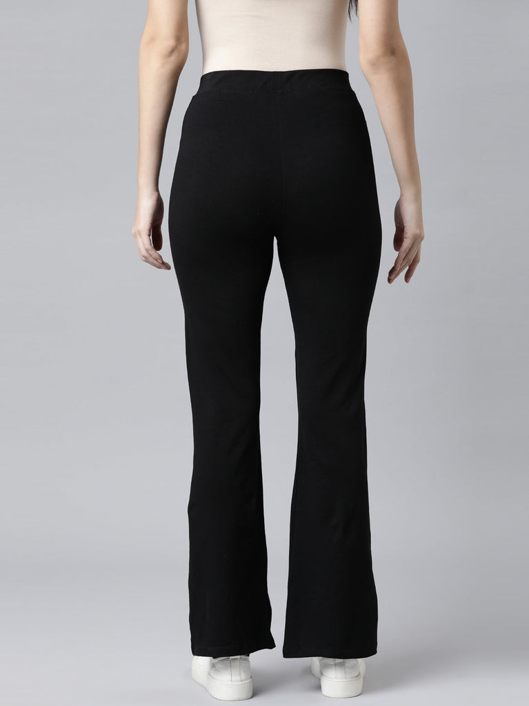 From running errands to casual chilling with friends, Solid Black Flared Pants are your perfect pair of bottomwear. Made from cotton stretch fabric, it has elasticised waistband with high rise waist.