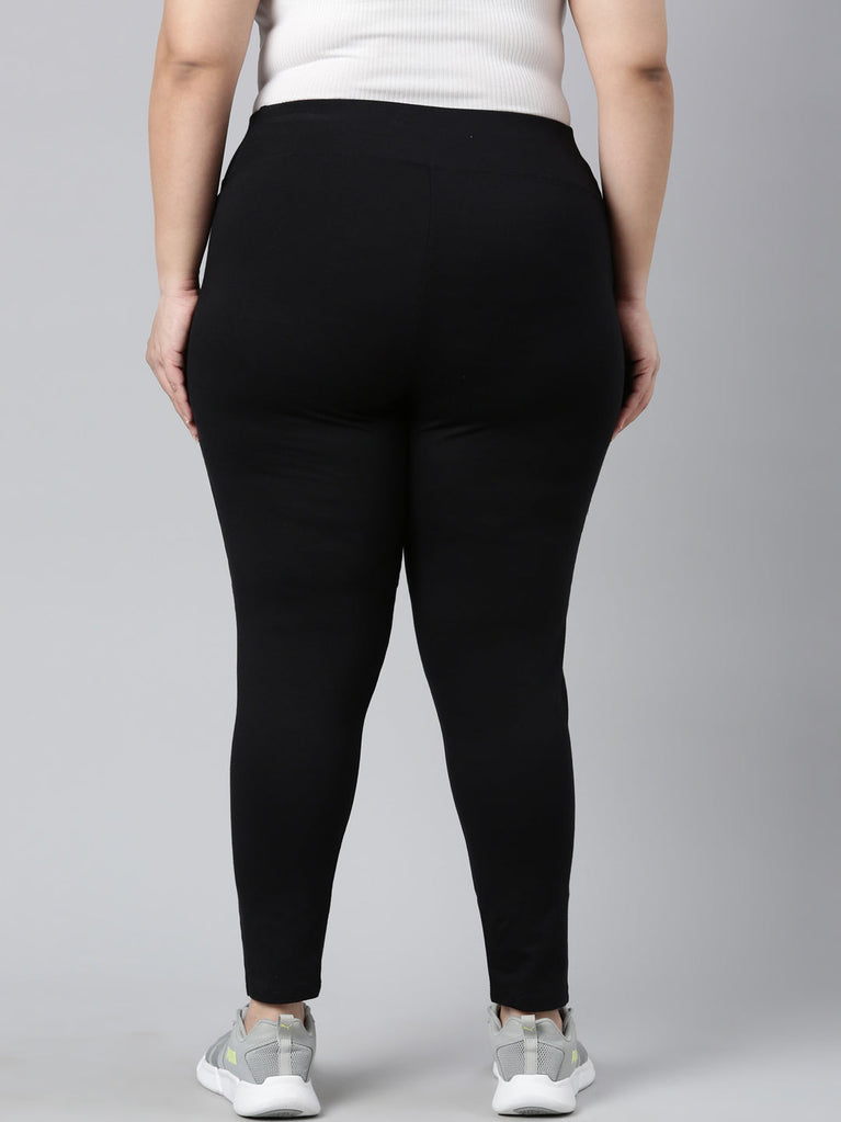 Have fun while sweating out in a pair of comfortable Solid Black yoga Leggings. Made from cotton stretch fabric, it has a high rise elasticised waistband & is of ankle length.