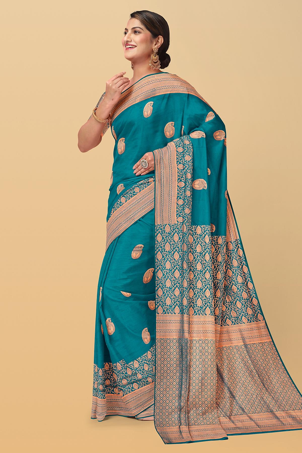Latest RAMA GREEN BUTTIS SILK BLEND Saree with SELF ZARI border. This saree comes with PLAIN WITH BORDER SILK BLEND blouse.