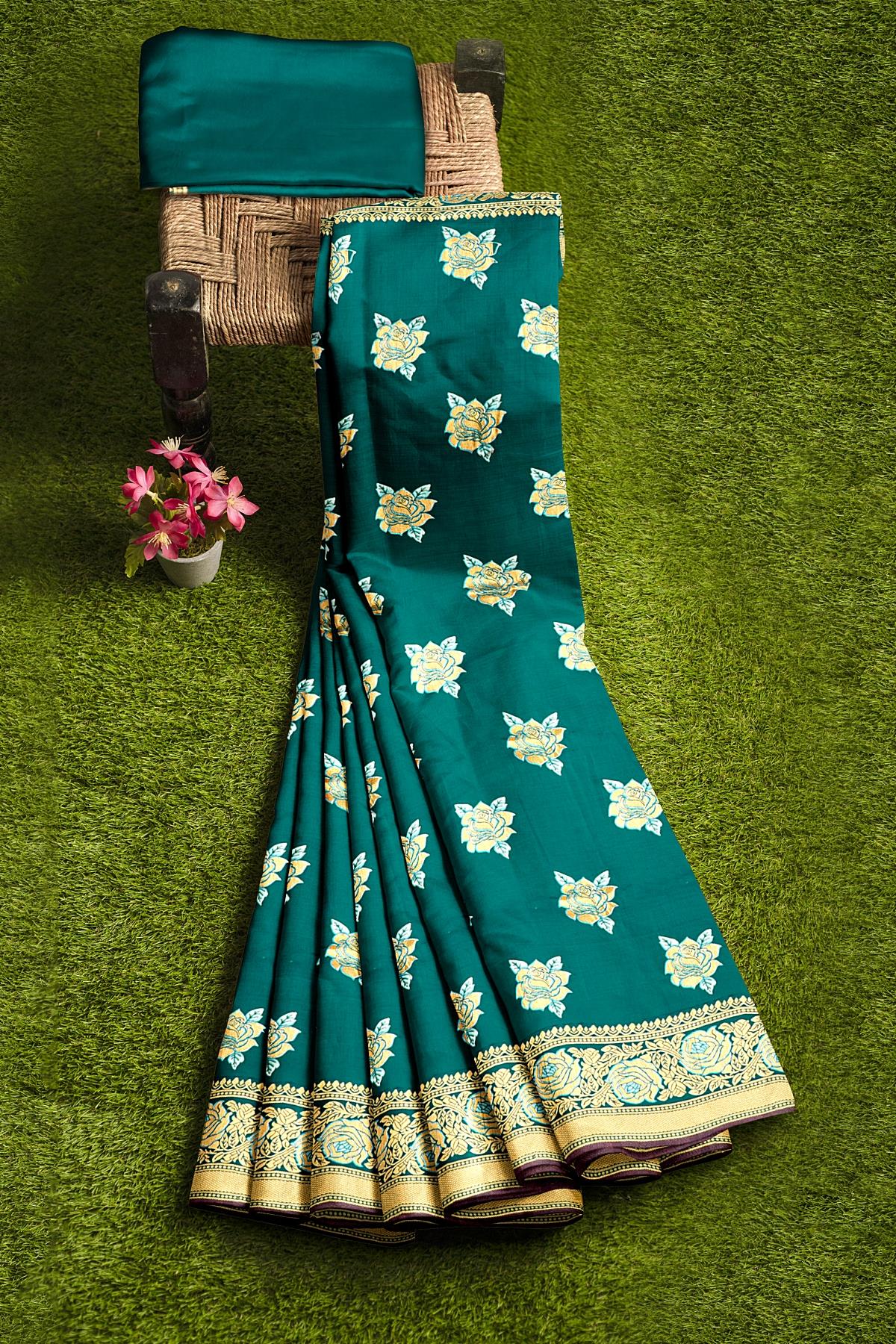 Latest RAMA GREEN BUTTIS SILK BLEND Saree with SELF ZARI border. This saree comes with PLAIN WITH BORDER SILK BLEND blouse.