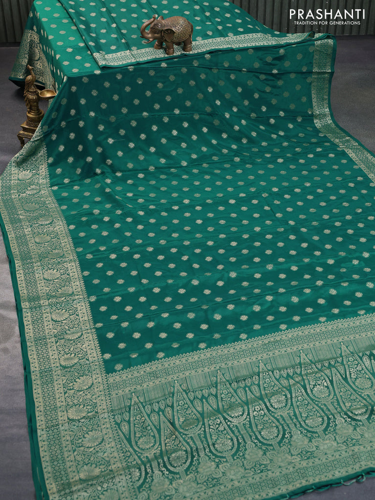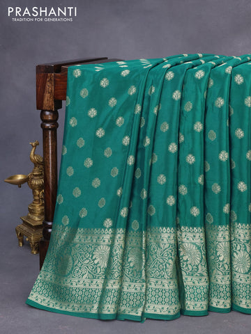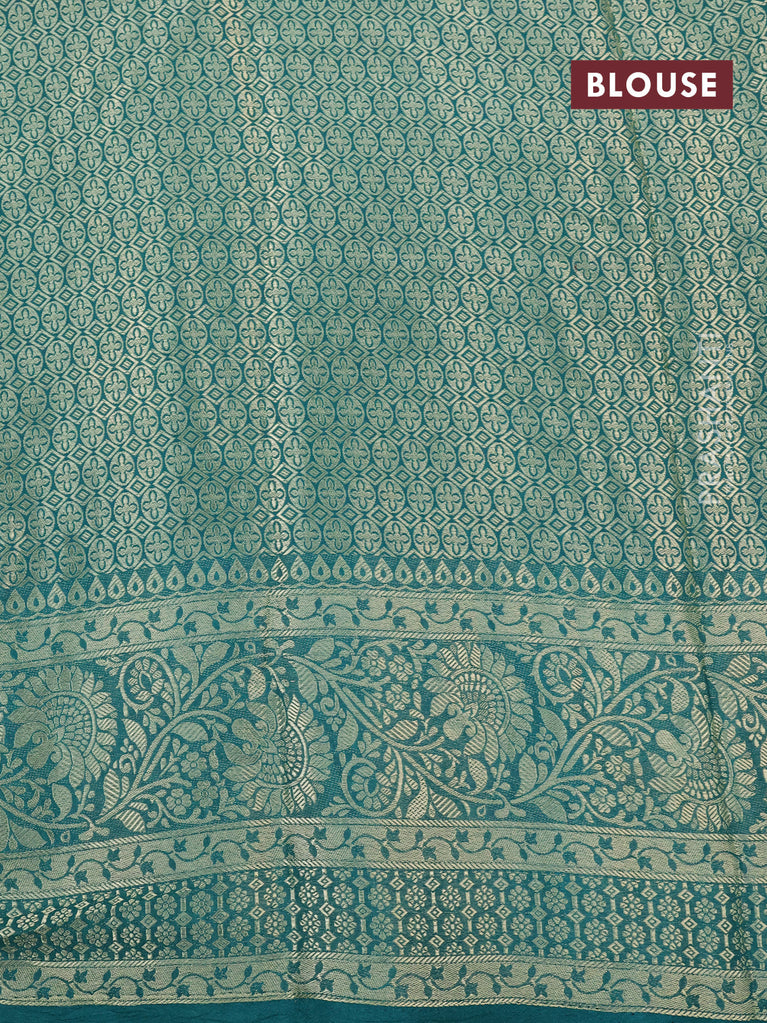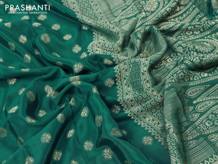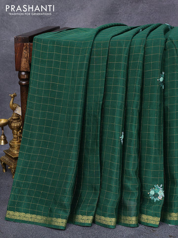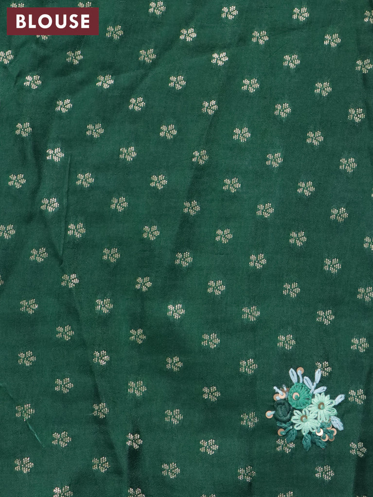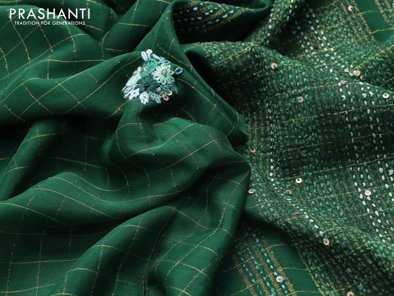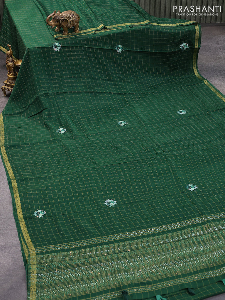 Adorned in a sea green Designer Crepe Saree, embellished with floral buttis in mirror work, embrace traditional elegance. The self border with mirror and kardhana work adds a touch of sparkle. Perfect for festivals and casual outings, this saree comes with a matching blouse.