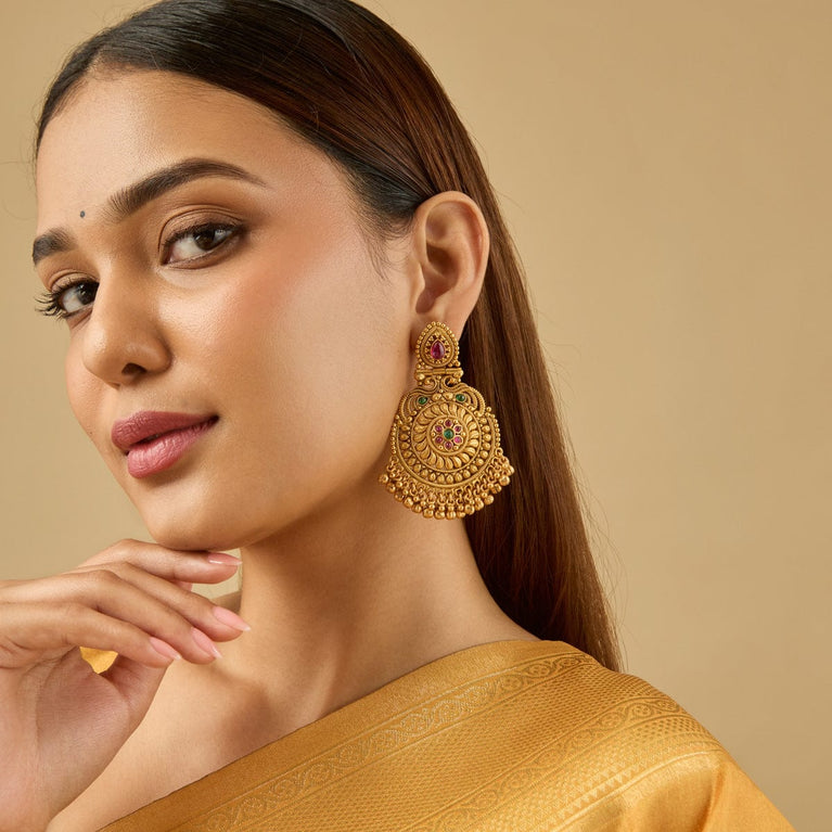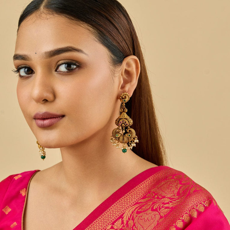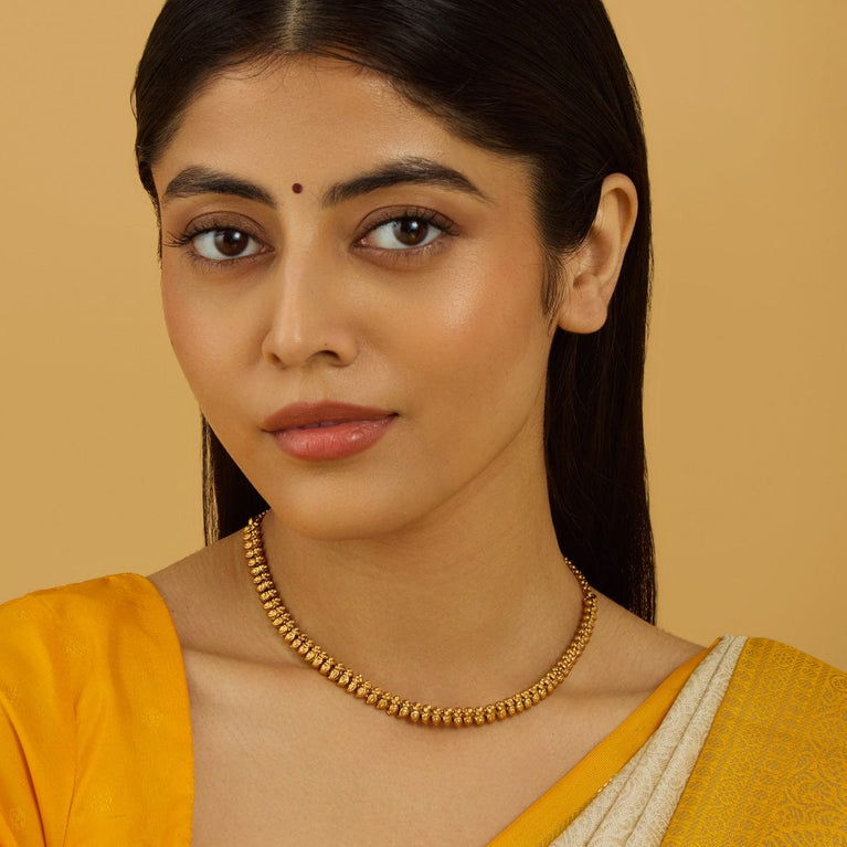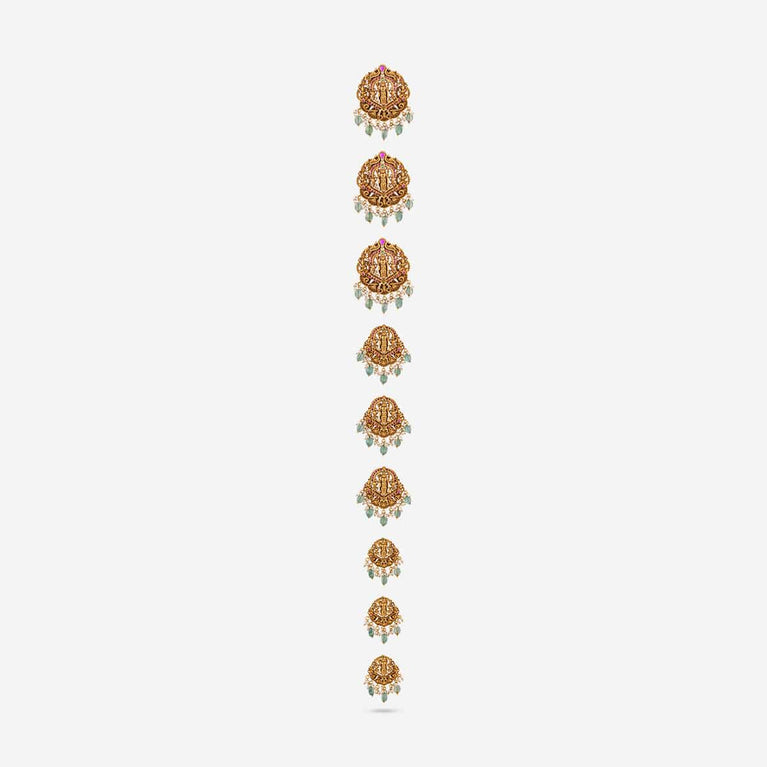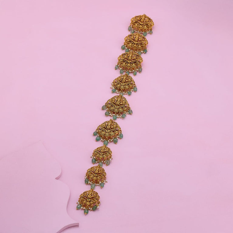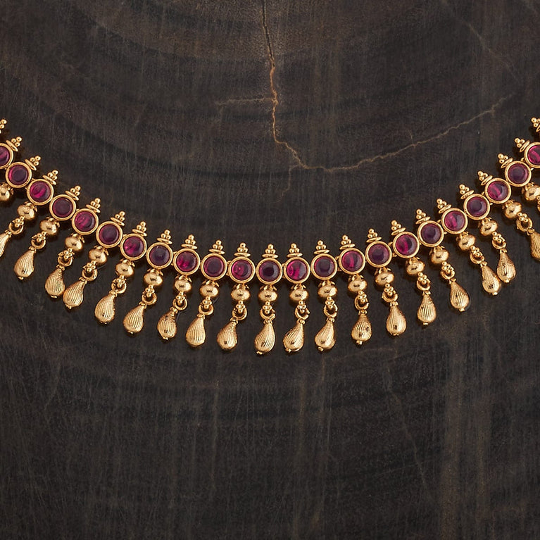 Beaded Design Antique ChainUpgrade your look with this antique mala, a short necklace featuring green or ruby-green synthetic stones set in a gold polish. Perfectly designed to pair with Indo-Western outfits, this elegant piece adds a touch of sophistication and charm, making it an ideal accessory for both casual and special occasions.