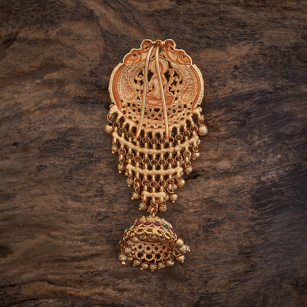 Add a touch of elegance to your hairstyle with this antique hair brooch. Its intricate design, featuring ruby and green stones with a gold polish, gives it a classic Indian touch. The Goddess Lakshmi motif adorned at the top makes it a perfect accessory for festive looks. Wear it with a heavy saree or lehenga to complete your look.