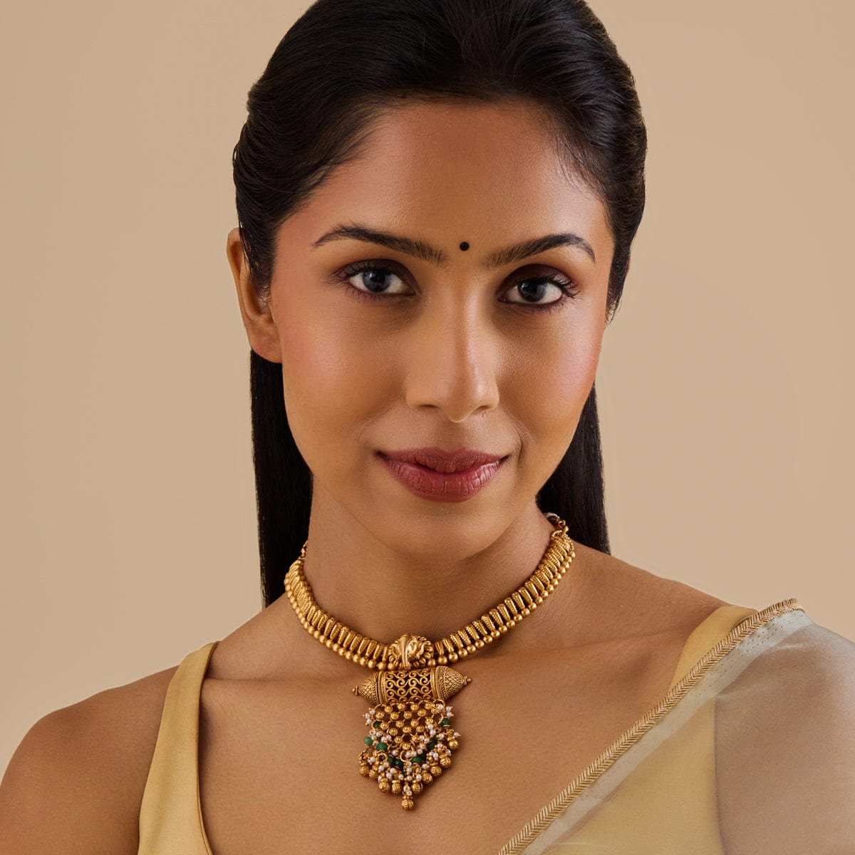 This antique necklace features green stones paired with gold polish, creating a traditional yet timeless appeal. The bold pendant and intricate beadwork add depth to the design, making it a standout piece. Style it with a silk saree or lehenga to bring out its rich details and heritage-inspired charm.