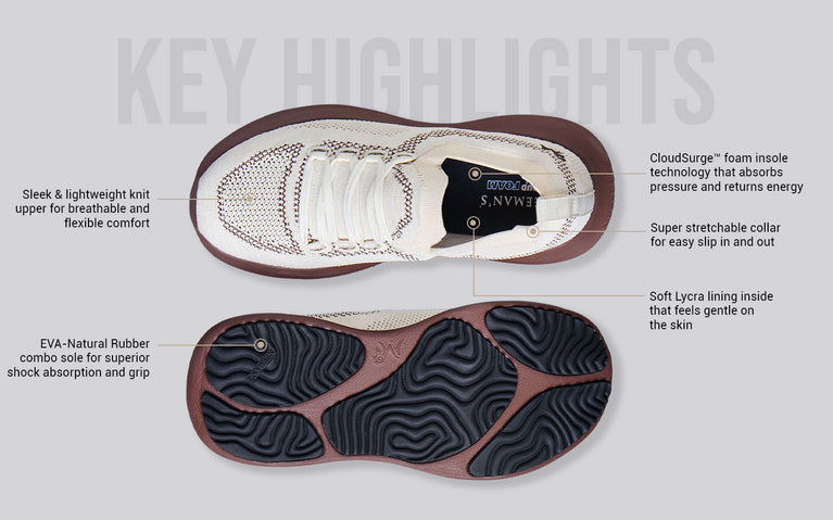 With the dual tech cushioning of our CushyWalk™ midsole and CloudSurge™ foam insole, Begin Walk Ease absorbs pressure and returns energy, adding a bounce to your steps to take on the day’s hustle. Its adaptive performance knit design hugs your feet snugly while keeping them breezy & cool and a pressure-mapped outsole reduces stress on your joints & ankles. This is minimal, with all heart.