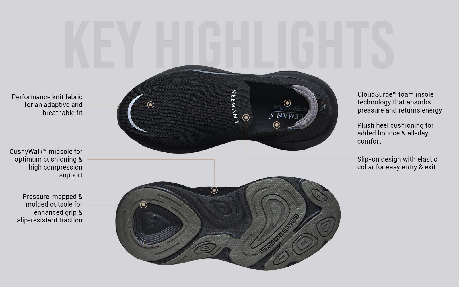 With the dual tech cushioning of our CushyWalk™ midsole and CloudSurge™ foam insole, Begin Walk Ease absorbs pressure and returns energy, adding a bounce to your steps to take on the day’s hustle. Its adaptive performance knit design hugs your feet snugly while keeping them breezy & cool and a pressure-mapped outsole reduces stress on your joints & ankles. This is minimal, with all heart.