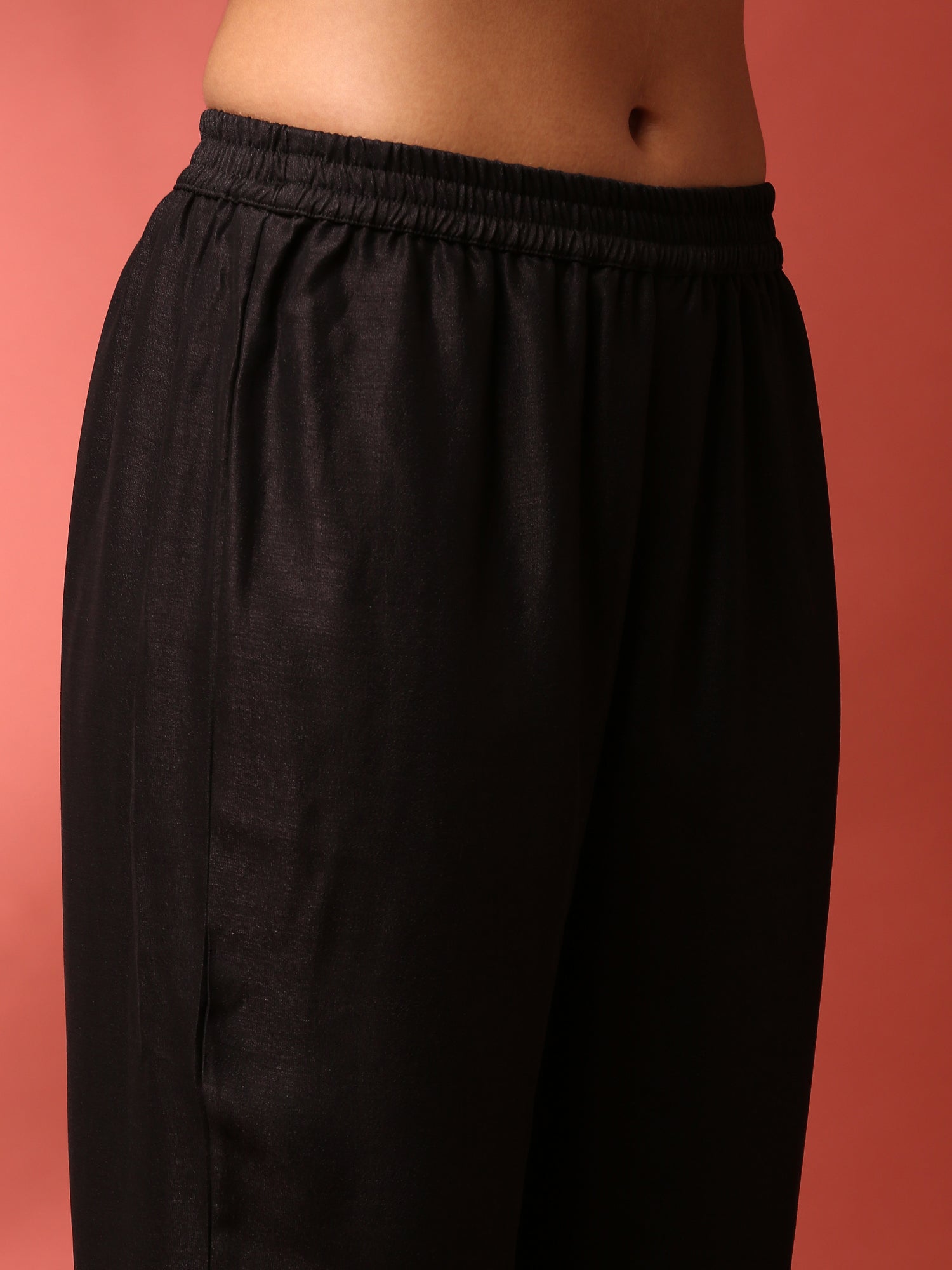 Step into timeless elegance with this Black Vichitra silk three-piece anarkali set, featuring delicate aari embroidery. Crafted from smooth, rich silk, this set offers a flawless fit and graceful flow, perfect for celebrations and festive occasions. Enhance your style effortlessly with this sophisticated ensemble that combines tradition with contemporary charm.