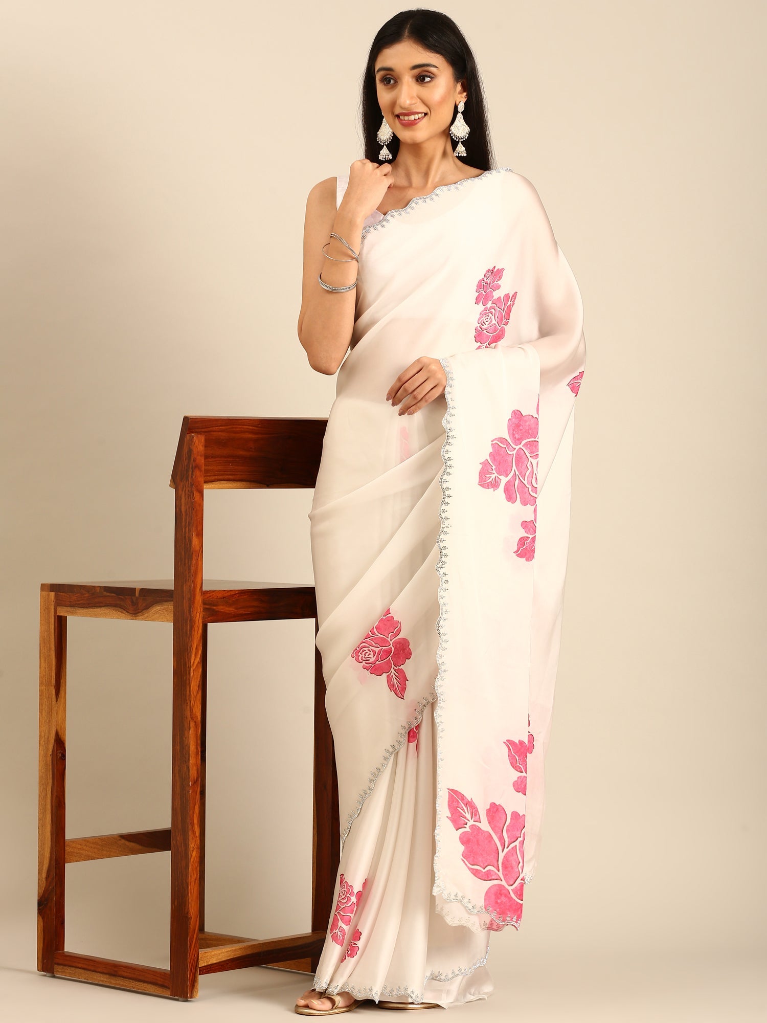 Elevate your elegance with this cream satin saree featuring delicate pink printed motifs enhanced by sparkling Swarovski embroidery. The luxurious satin fabric offers a smooth, lustrous drape that flatters every silhouette, while the intricate embroidery adds a touch of timeless glamour. Perfect for special occasions, this saree blends traditional charm with contemporary sparkle, making you the center of attention wherever you go.