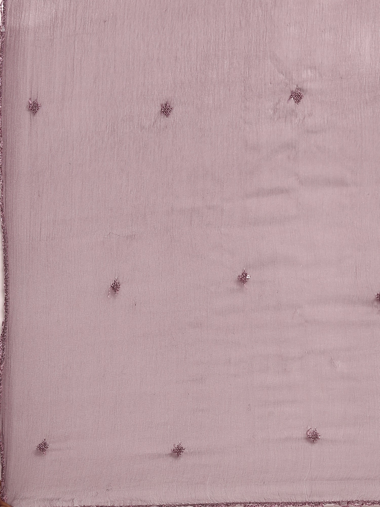 Elevate your ethnic wardrobe with this exquisite Lilac Chinnon three-piece ensemble. Crafted from premium chinnon fabric, known for its lightweight breathability and elegant drape, this set combines traditional sophistication with contemporary styling. The soft lilac hue offers versatility for both festive occasions and everyday wear.