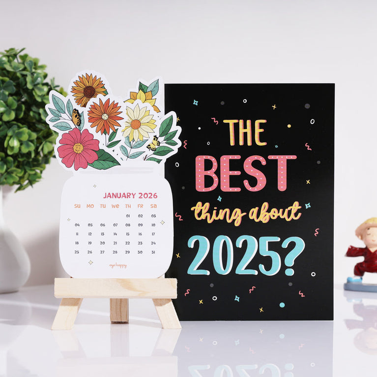 Start 2026 with beauty, smiles, and heartfelt gratitude! This combo features a New Year Mirror Card, a unique and adorable card with a surprise mirror inside. perfect for thanking someone who made 2025 easier. Paired with it is the Aesthetic Desk Calendar, bringing a burst of color and charm to your workspace each month. Ideal for anyone who loves soft, uplifting vibes or as a thoughtful, year-long gift.Specifications:Mirror Card: 12.5 x 17.8 cmDesk Calendar: 9 x 19.5 cmA beautiful gift set to spread gratitude, smiles, and daily inspiration all year long. ✨