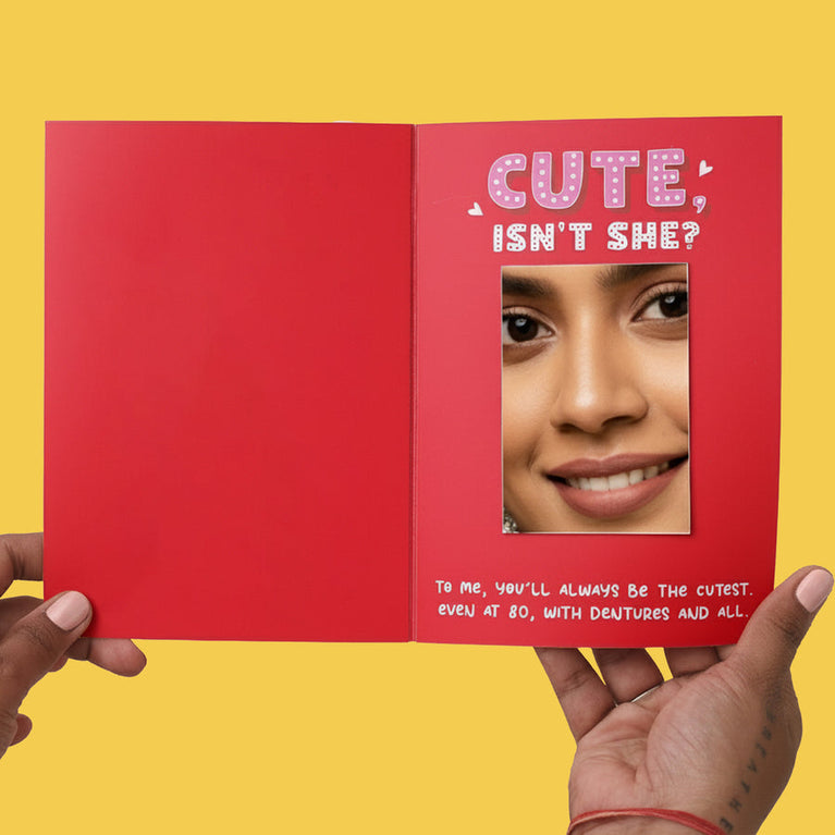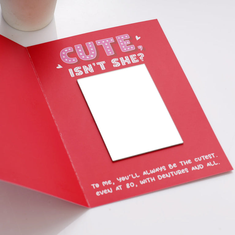 Looking for a fun, unforgettable way to propose, celebrate an engagement, or simply show your fiancée how excited you are for your future together? Greeting cards are timeless, and the Future Wife Mirror Card is a modern, witty surprise guaranteed to make her smile.The MessageThis card delivers a playful buildup to a beautiful compliment:Front: The card features a vibrant design and boldly declares your love and commitment with the fun, engaging message: "MEET MY FUTURE WIFE"Inside: When she opens it, she’ll find her own reflection thanks to the attached mirror, along with the sweet, playful text: "CUTE, ISN'T SHE?" This is followed by a loving commitment that is both sincere and humorously realistic: "To me, you'll always be the cutest. Even at 80, with dentures and all."It’s the perfect way to playfully call her beautiful and express your enduring love with a touch of humor.Specifications-Size of the Card : 25.4 x 17.8 cmsThe greeting card is elegantly wrapped in an envelope and meticulously packaged to ensure the mirror inside remains safe and intact during delivery.Note: This is a pre-packaged gift and cannot be customized.