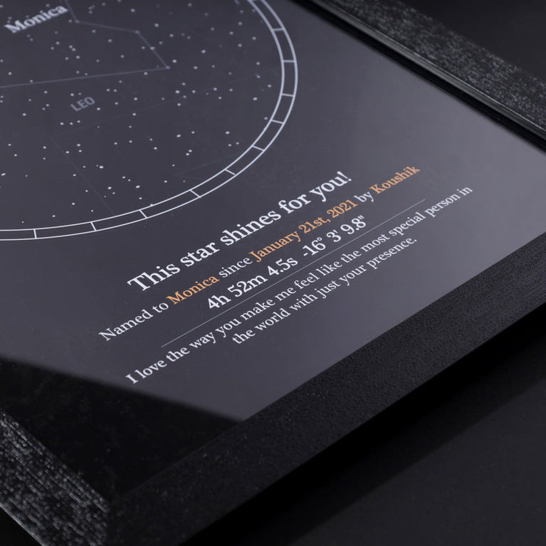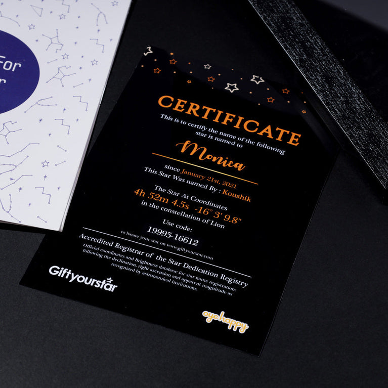 Specifications:Size of the frame: 33.53 x 25.15 cm.Please note that Oye Happy is a facilitator for the naming service, GiftYourStar, which is an Accredited Registrar of the Star Dedication Archives.The star can only be booked for the current year, not for previous years. If you input the date of the occasion as 17/03/1987, the star will automatically be booked for the current year, regardless of the entered date.If the sender's name is not provided, we will list it as "Star is named by Special Person" on the certificates.