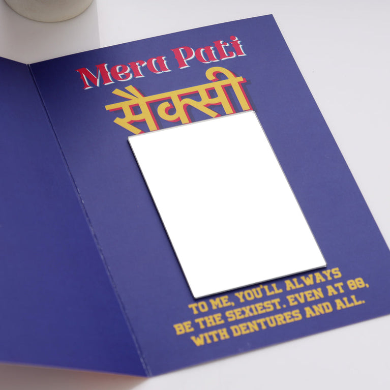 Looking for a fun, surprising, and heartfelt way to show your husband some love? Greeting cards are the ultimate classic romantic gesture, and the Mera Pati Sexy Mirror Card is a modern twist guaranteed to make him smile!The MessageThe card delivers a one-two punch of affection and humor:Front: The card teases with a sweet, partially completed thought: " DO RUPAYE KI पेप्सी "Inside: When he opens it, he’ll find his own reflection thanks to the attached mirror, along with the beautiful and straightforward reveal: " Mera Pati सेक्सी" (My Husband is Sexy) and the humorous, loving text, "TO ME, YOU'LL ALWAYS BE THE SEXIEST. EVEN AT 88, WITH DENTURES AND ALL. "It’s the perfect way to playfully call him handsome and genuinely express how much his love and presence mean to you.Specifications-Size of the Card : 25.4 x 17.8 cmsThe greeting card is elegantly wrapped in an envelope and meticulously packaged to ensure the mirror inside remains safe and intact during delivery.Note: This is a pre-packaged gift and cannot be customized.