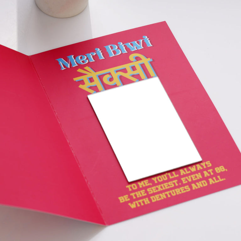 Looking for a fun, surprising, and truly memorable way to celebrate your wife? Greeting cards never go out of style for matters of love, and the Meri Biwi Sexy Mirror Card is a contemporary twist that's guaranteed to make her laugh out loud and feel adored.The MessageThis card cleverly blends Indian pop culture humor with genuine affection:Front: The card teases with a sweet, partially completed thought: "DO RUPAYE KI पेप्सी".Inside: When opened, the card reveals an attached mirror (for a surprise reflection!) and the bold, loving declaration: "Meri Biwi सेक्सी" (My Wife is Sexy). This is followed by a commitment of love that is both sweet and hilariously realistic: "TO ME, YOU'LL ALWAYS BE THE SEXIEST. EVEN AT 88, WITH DENTURES AND ALL."It’s the perfect, playful way to call her beautiful while expressing that your love will endure, humorously, through everything.Specifications-Size of the Card : 25.4 x 17.8 cms The greeting card is elegantly wrapped in an envelope and packaged carefully to ensure the mirror inside remains safe and secure during transit.Note: This is a pre-packaged gift and cannot be customized.