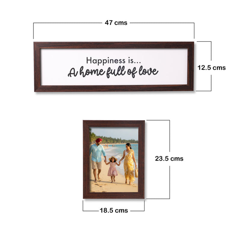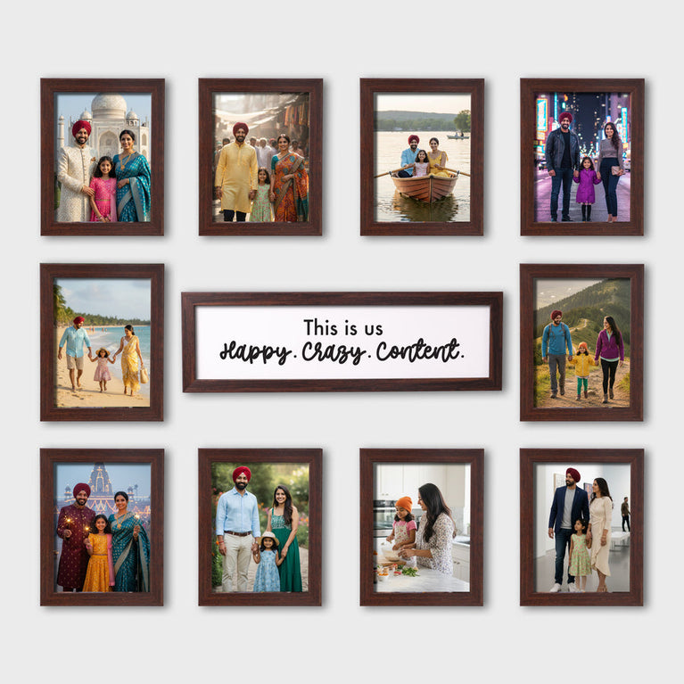 Here's something to turn your wall into a story. More than just a wall décor, this is a wall of emotions. 10 frames to hold your happiest memories, and 1 frame in the center for the date or message that ties them all together. A perfect way to celebrate love, family, and every little moment that made life beautiful.Specifications :Size of Frames - 23.5x18.5cmsSize of the Rectangular Frame - 47x12.5cms
