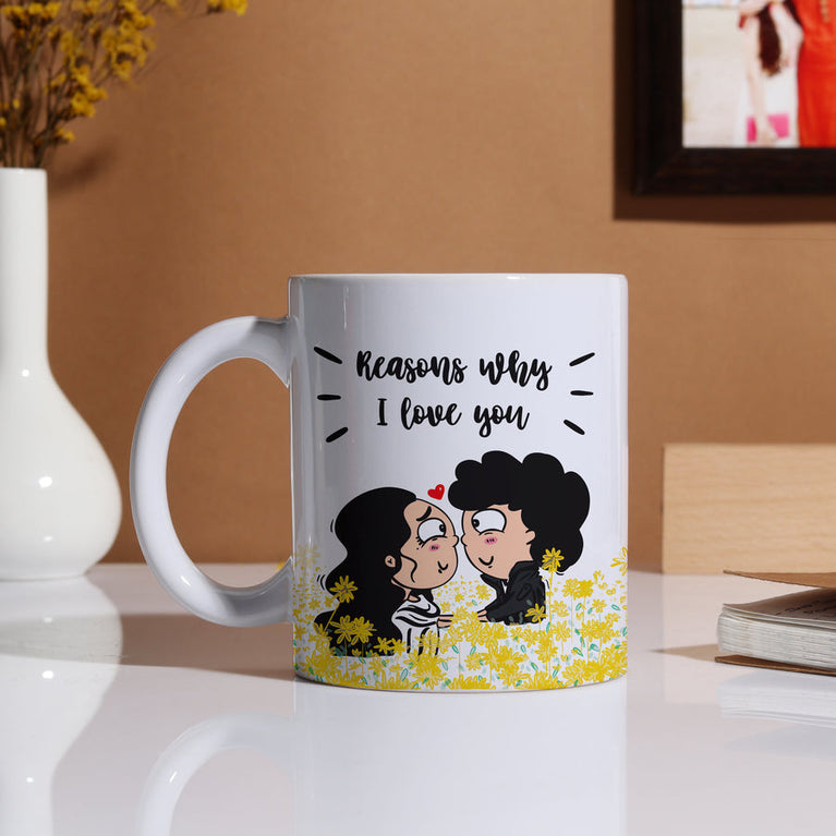 Reasons Why I Love You Mug: Surprise your special one with this romantic mug. A coffee mug with the most adorable illustrations telling your special one why you love him/her. This surprise is known to kill with its cuteness.