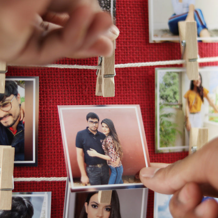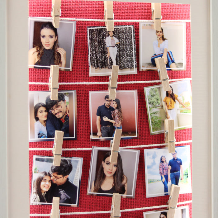 The gift is complemented with 12 of your favorite photos aesthetically clipped using wooden clips. The frame is fitted with a battery operated LED strip which lights up when you turn the switch.