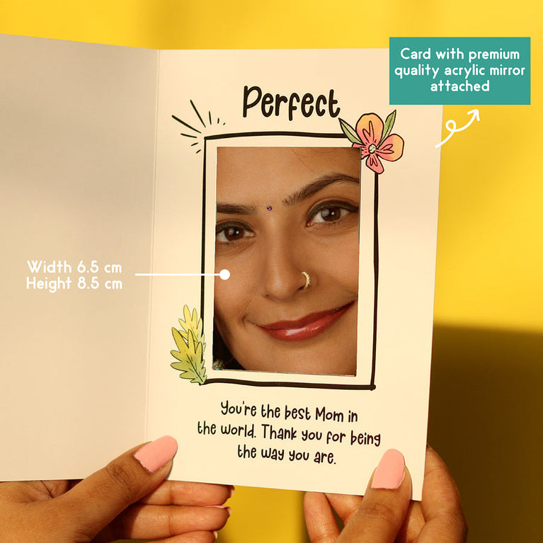 Mirror Card for Mom: Add a touch of magic to your greeting card and express how much your mom means to you. This special greeting card is designed with a mirror attached to it so that when your mom opens the card, she will see her own face reflecting on it. Content on front of the card: There’s only one word for you Maa Content Inside of the card (which also has a mirror): Perfect..! You’re the best Mom in the world, thank you for being the way you are.