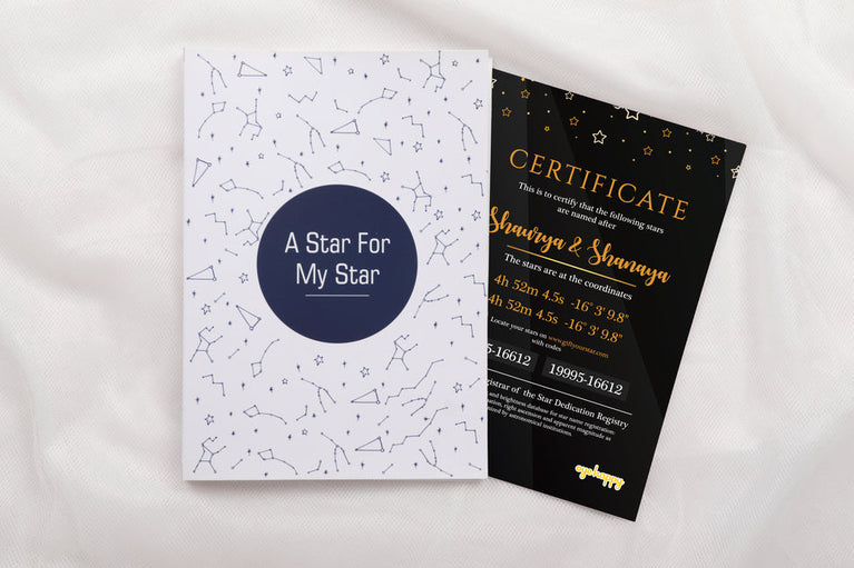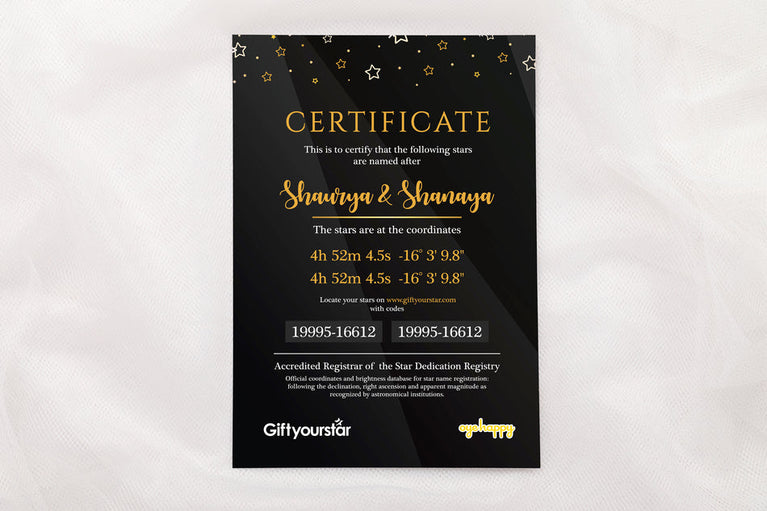 Specifications:Oye Happy is a verified facilitator between the naming service and the customer. The company, GiftYourStar, is an Accredited Registrar of the Star Dedication Archives.Size of the frame (with glass): A4The star can only be booked for the current year, not for previous years. If you input the date of the occasion as 17/03/1987, the star will automatically be booked for the current year, regardless of the entered date.