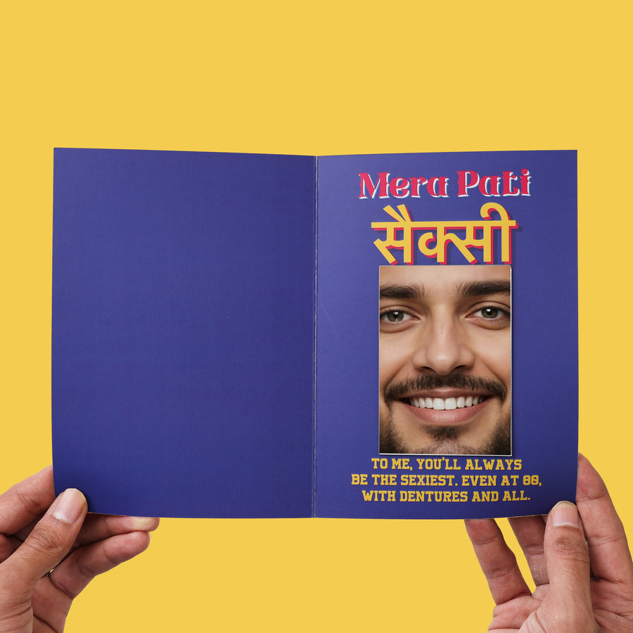 Inside: When he opens it, he’ll find his own reflection thanks to the attached mirror, along with the beautiful and straightforward reveal: " Mera Pati सेक्सी" (My Husband is Sexy) and the humorous, loving text, "TO ME, YOU'LL ALWAYS BE THE SEXIEST. EVEN AT 88, WITH DENTURES AND ALL. "