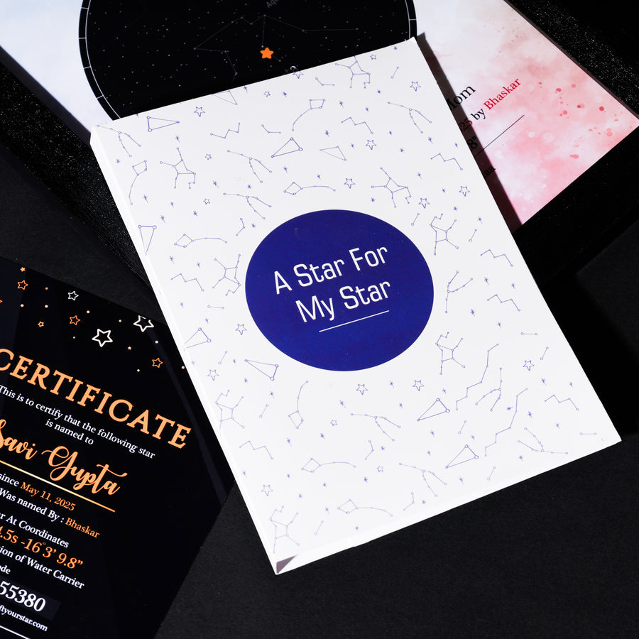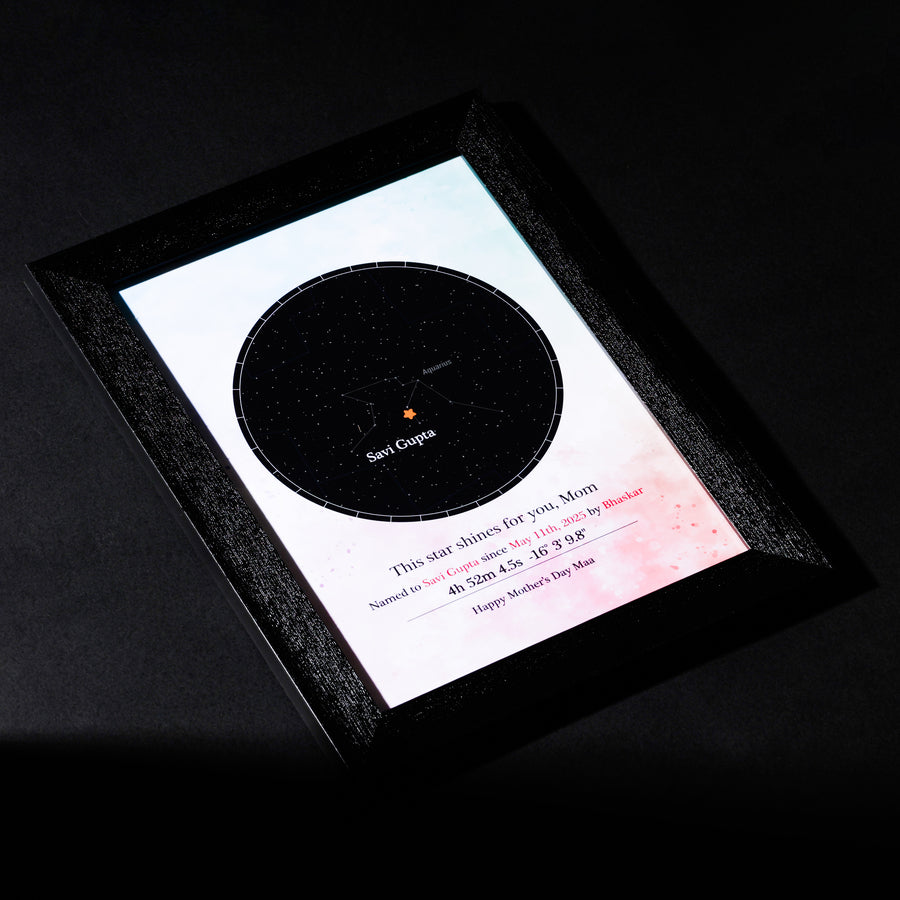 Name a star after your mom and frame it with love, complete with her name and constellation details. Simply share her name, select the zodiac and the date, and a star will be named exclusively for them.