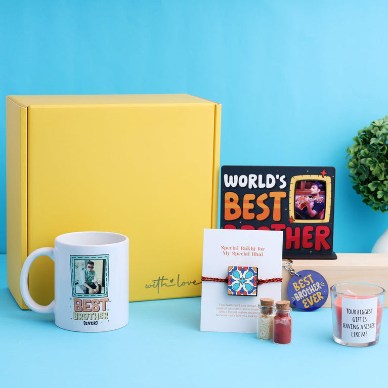 Secret Photo Rakhi - This rakhi unfolds your memories in a magical way. It is customized with 6 Photos Just click on customise now to upload the photos. Candle - A candle that comes with a funny message to pull your brother's leg in the cutest way.Rakhi Card - A heartfelt card to send your love and blessings along with the rakhi, making the celebration extra special.Best Bro Custom Table top - Give your brother a daily reminder of how amazing he is with this customizable tabletop photo frame.Best Brother Mug - Make your brother feel special this rakhi with Best Brother ever mug. Best Brother Keychain – Featuring the cutest message, this keychain is designed to make your bro smile wide. 1 bottle of roli and 1 bottle of chawal to add a touch of tradition to the hamperSpecifications: Size of the Table Top - 14.6 x 11.4 cmsRakhi card - 10 x 7 inchesCapacity of the Mug - 330ml