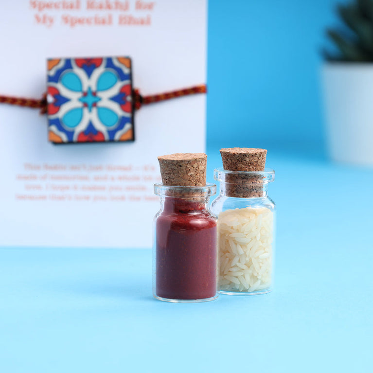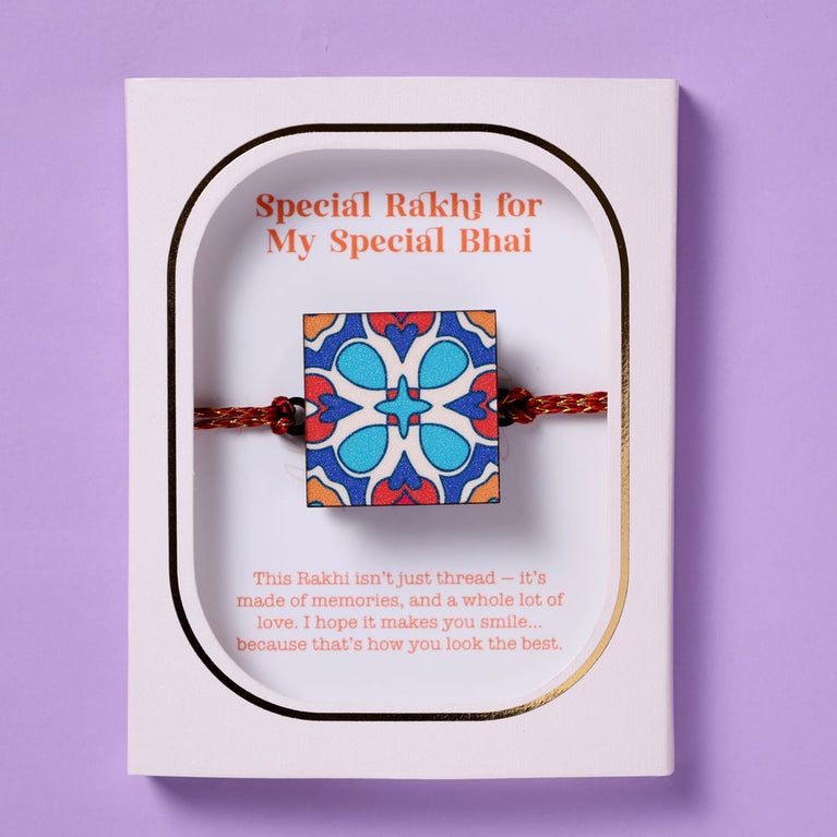 A Rakhi set that’s as adorable as your Bhaiya-Bhabhi!! This Bhaiya-Bhabhi Rakhi box is more than just rakhis. It’s a small bundle of love. It has a special wealth stone rakhi for your brother and a lumba rakhi for your bhabhi that doubles up as an earring. We’ve even added a matching second jhumka to make it a full pair for your Bhabhi. This Rakshabandhan special box is sweet, thoughtful, and makes Rakhi extra special for both of them.