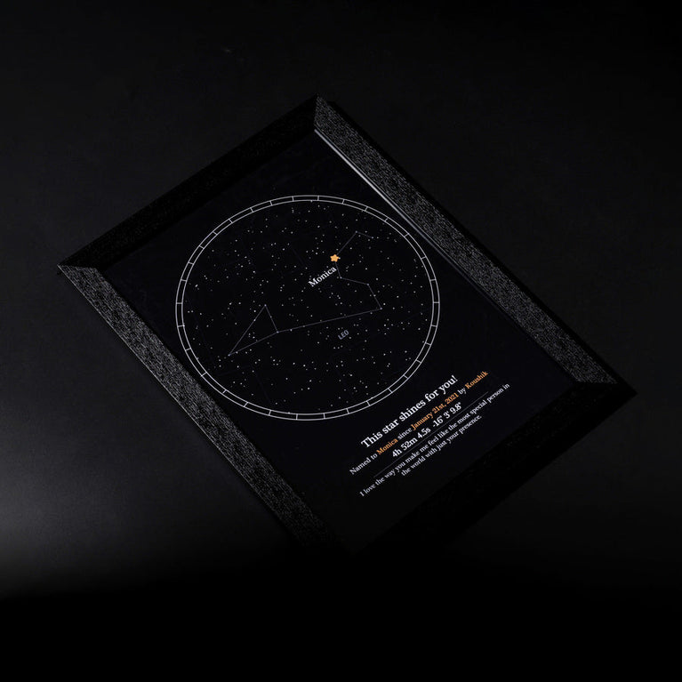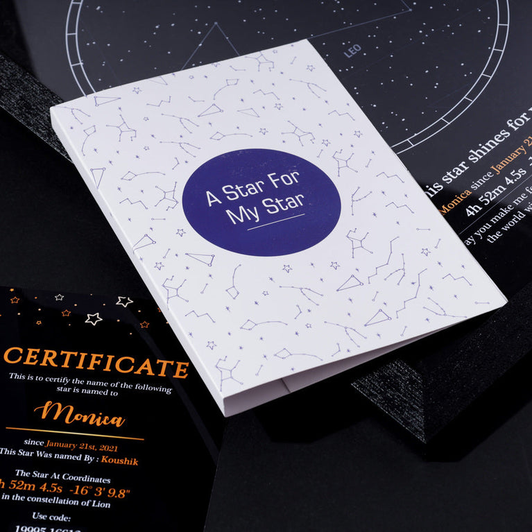 Specifications:Size of the frame: 29.74 cm x 41.91 cm.Please note that Oye Happy is a facilitator for the naming service, GiftYourStar, which is an Accredited Registrar of the Star Dedication Archives.The star can only be booked for the current year, not for previous years. If you input the date of the occasion as 17/03/1987, the star will automatically be booked for the current year, regardless of the entered date.If the sender's name is not provided, we will list it as "Star is named by Special Person" on the certificates.