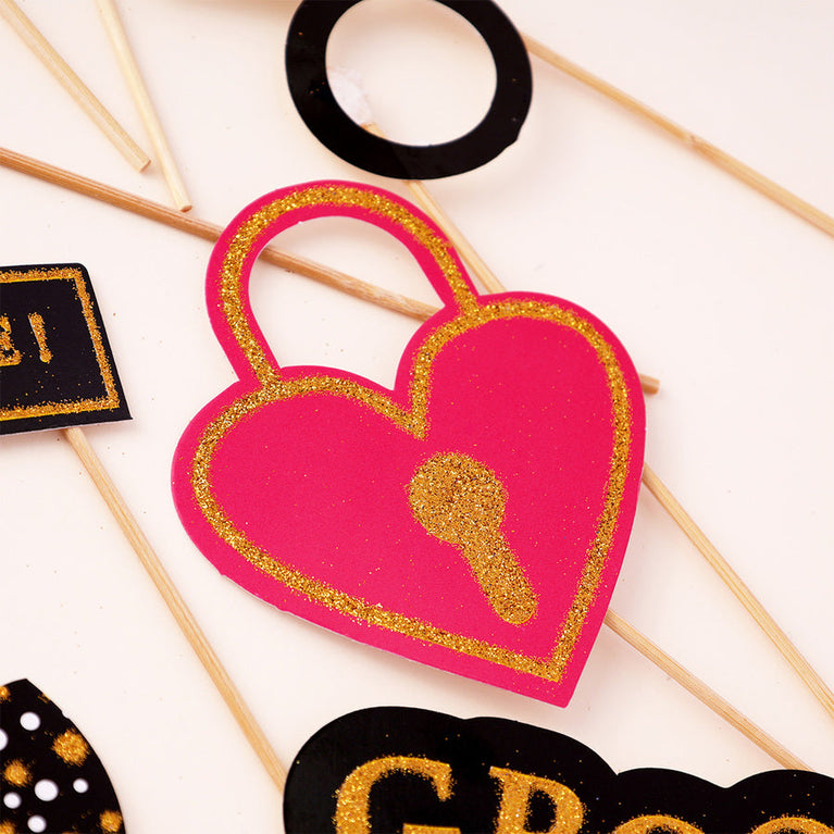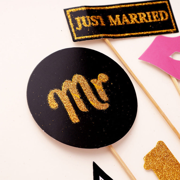 Add fun and flair to wedding celebrations with this complete party props kit! Perfect for Mehendi, Sangeet, and Reception events, it combines traditional and modern elements to create Insta-worthy memories. Pre-mounted props make photo sessions quick and entertaining, adding sparkle and style to every click.Specifications:Includes - "Bride" & "Groom" glasses, glittery turbans, diamond rings, "Just Married" signs, bridal dupatta, sehra props, and other stylish cutouts