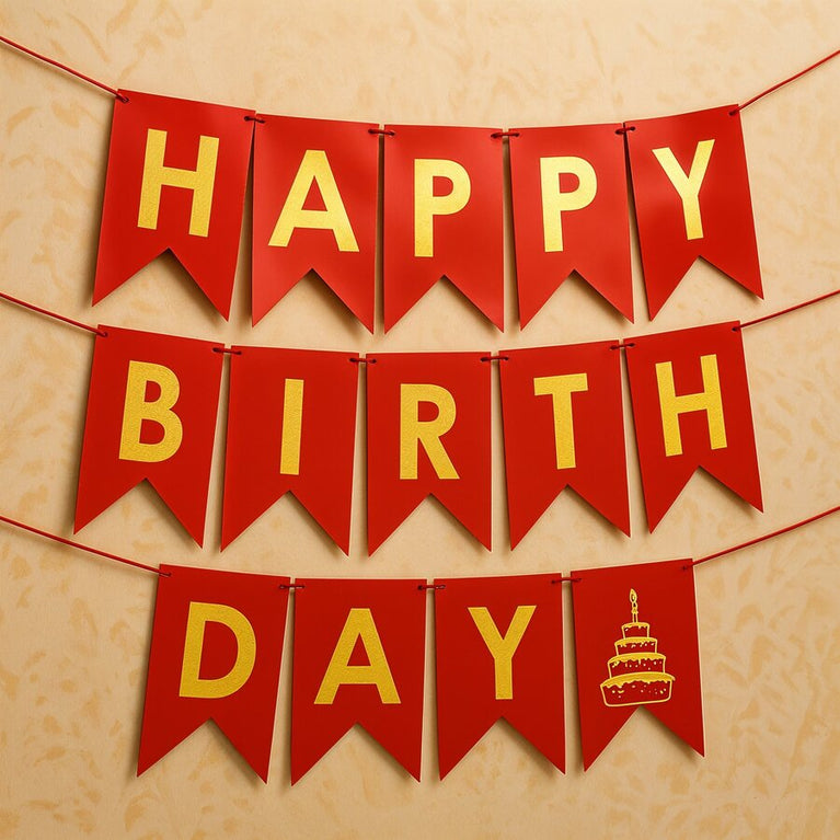 Make birthdays extra special with this vibrant Birthday Banner! Its bold red color with golden lettering adds a festive sparkle to any birthday party.The banner comes pre-assembled, so you can simply hang it and start the celebration. Made from premium-quality foil, it’s durable, shiny, and reusable. Plus, it includes a ribbon for easy hanging, making your décor hassle-free and photo-ready!Specifications:Color - Red with Golden LettersMaterial - Premium Foil