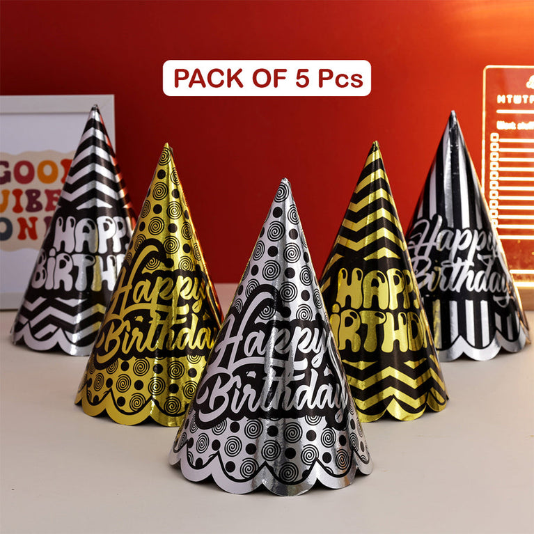Add sparkle to your celebrations with these Metallic Party Caps! Designed to bring a fun and festive vibe, these colorful hats are perfect for birthdays and other happy occasions.Lightweight and easy to wear, each cap comes with an elastic string for a secure and comfortable fit.Specifications:Number of Caps - 5Material - Metallic