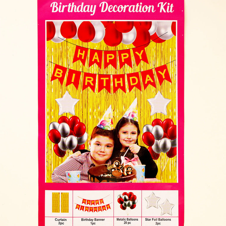Make every birthday celebration vibrant and unforgettable with this complete decoration kit! Perfect for kids, adults, or family birthdays, it adds a festive and colorful touch to any party. From creating a stylish photo corner to filling the room with fun décor, this kit has everything you need for a joyful and Instagram-worthy celebration.Specifications:Includes - 2 golden foil curtains, “Happy Birthday” banner, Red & white metallic balloons, Star foil balloons