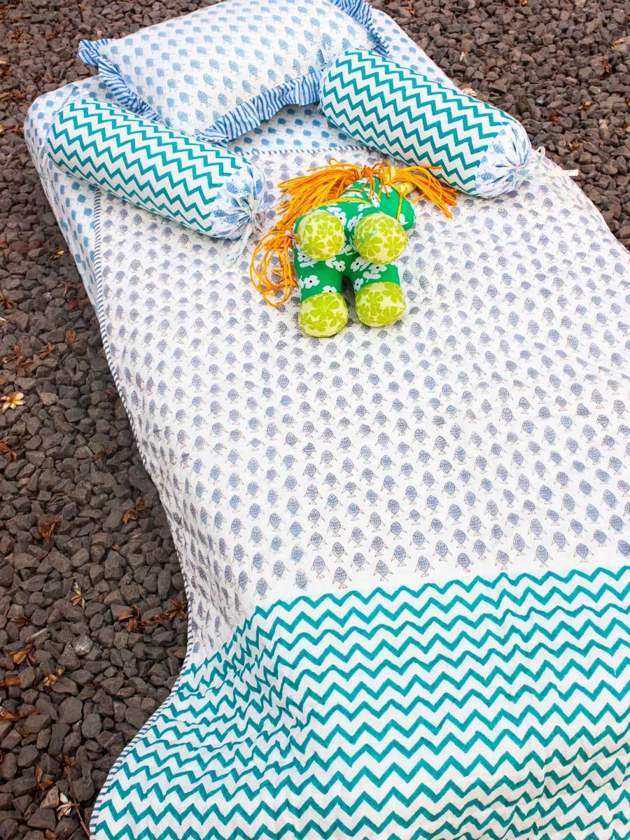 Dress up your baby's crib/cot with our lovely hand block print bolsters made with 100% GOTS certified organic cotton. The bolster cover can be easily removed for washing. This set contains two bolster pieces.
