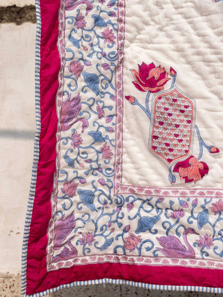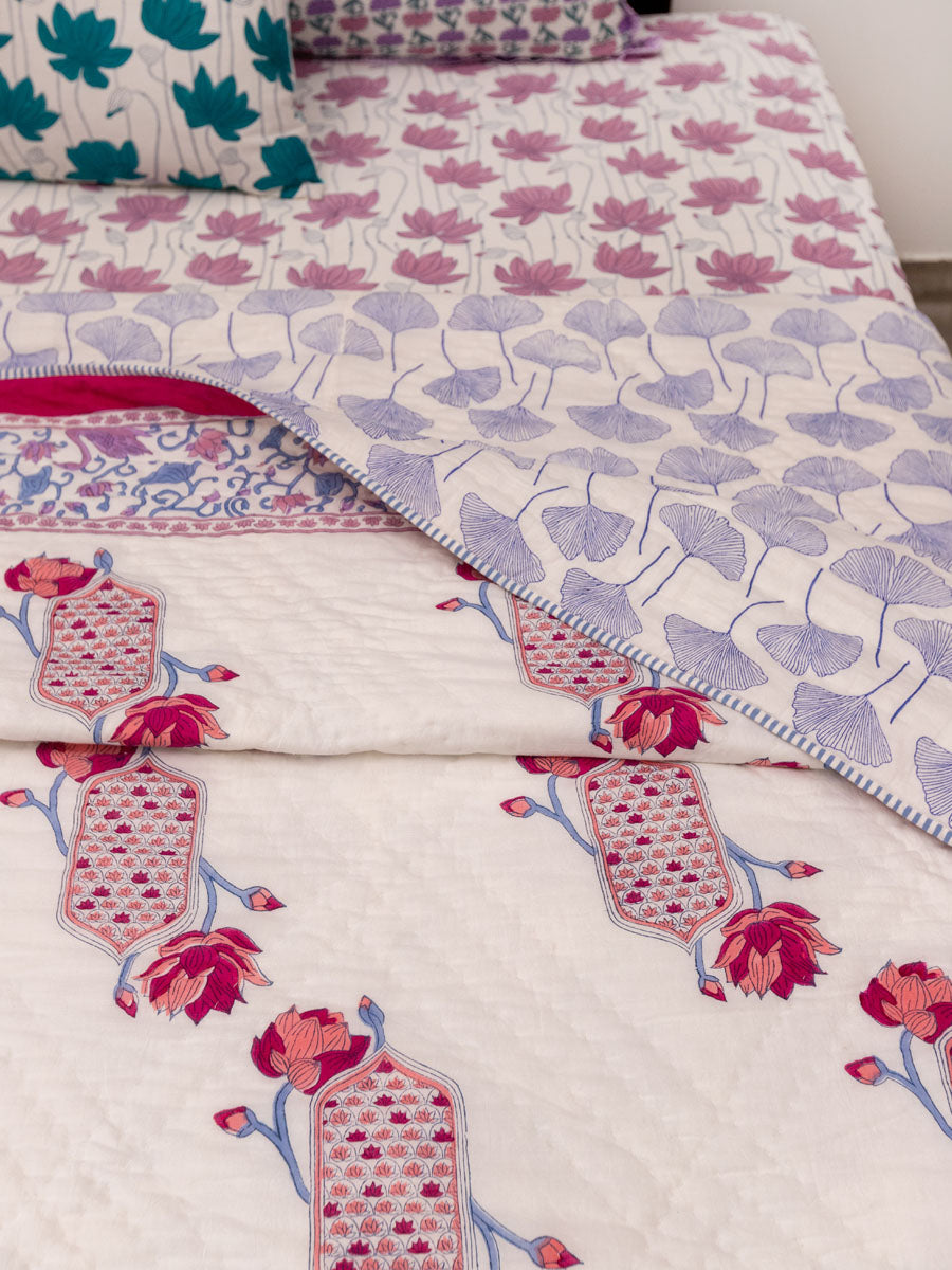 Padma or the Lotus is a central figure in many art forms including Pichhwai. It's a flower with meaning, beauty, and great cultural significance. The origin of the Lotus in Hindu mythology goes as far back as 'Samudra Manthan'. Its first association is with Lakshmi who also emerges from 'Samudra', hence, is referred to as Padmaja or Padmavati. This hand block printed home textiles collection is inspired by the beautiful lotus and other nature inspired elements.