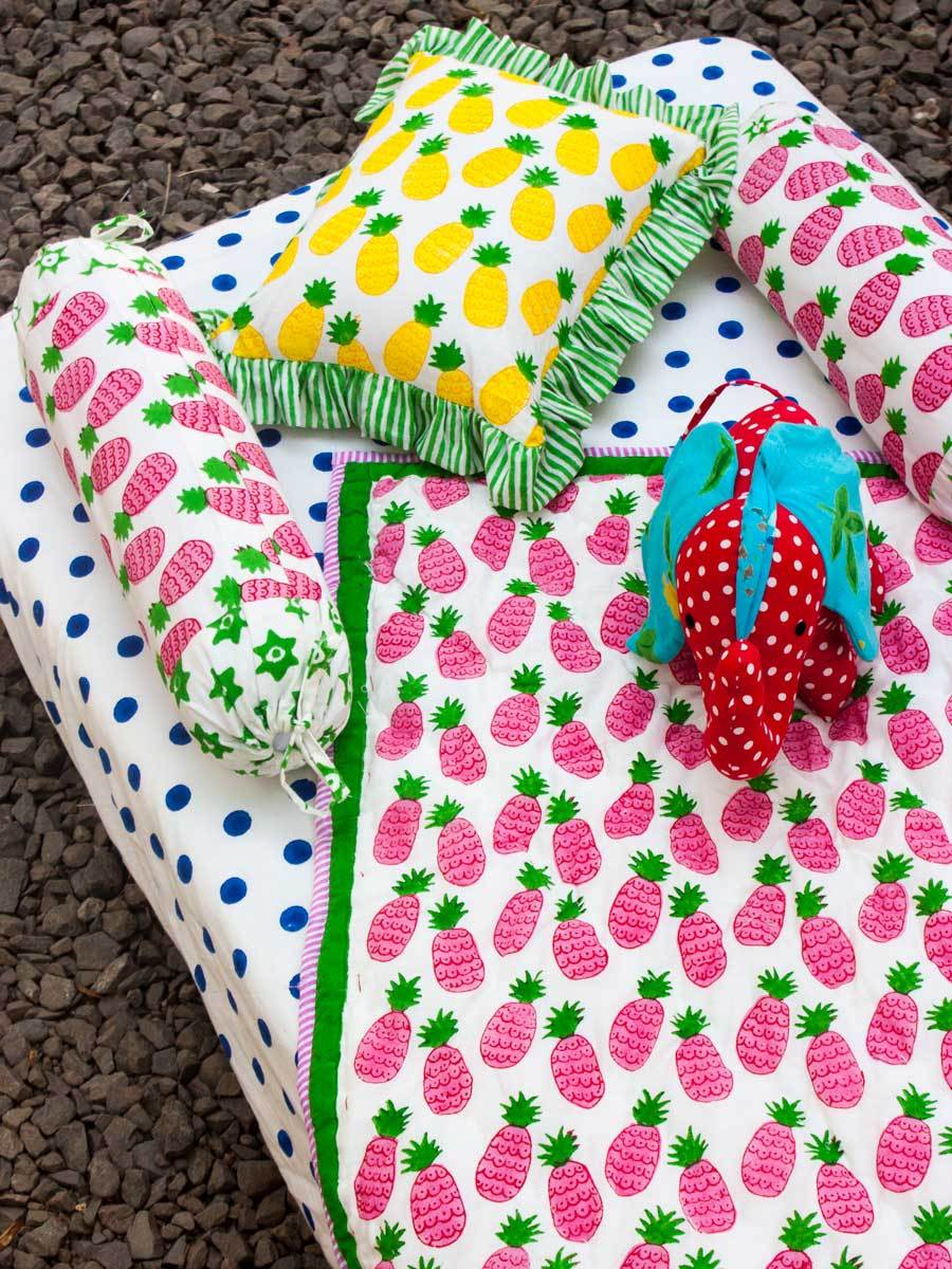 Presenting playful crib/cot hand block print GOTS certified organic cotton fitted sheets. The sheet contains elastic on the sides for easy operation and a snug fit. Made to fit all standard sizes of cots and cribs.
