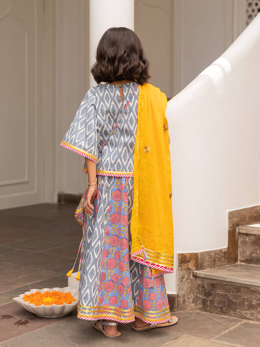 - Set includes: Top (with bell sleeves), skirt and dupatta