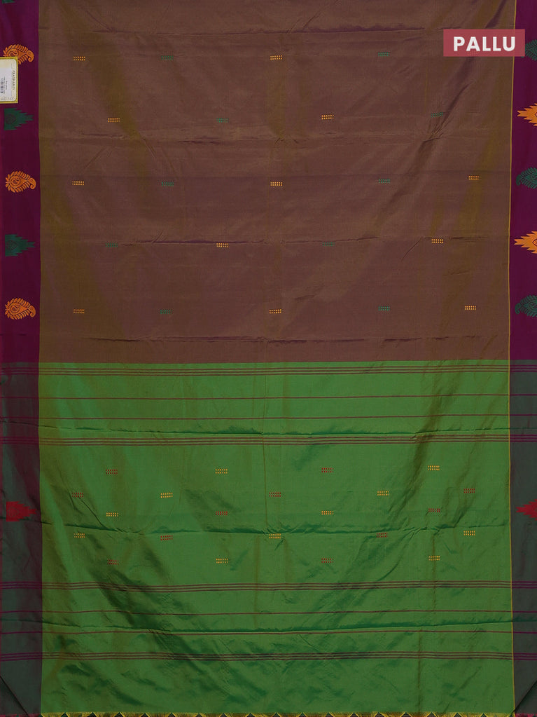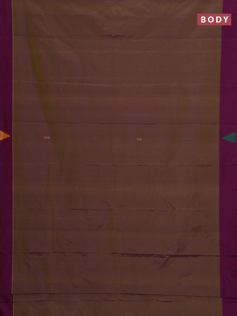 Arani semi silk saree dual shade of violet and dual shade of green with copper zari woven buttas and copper zari woven butta border