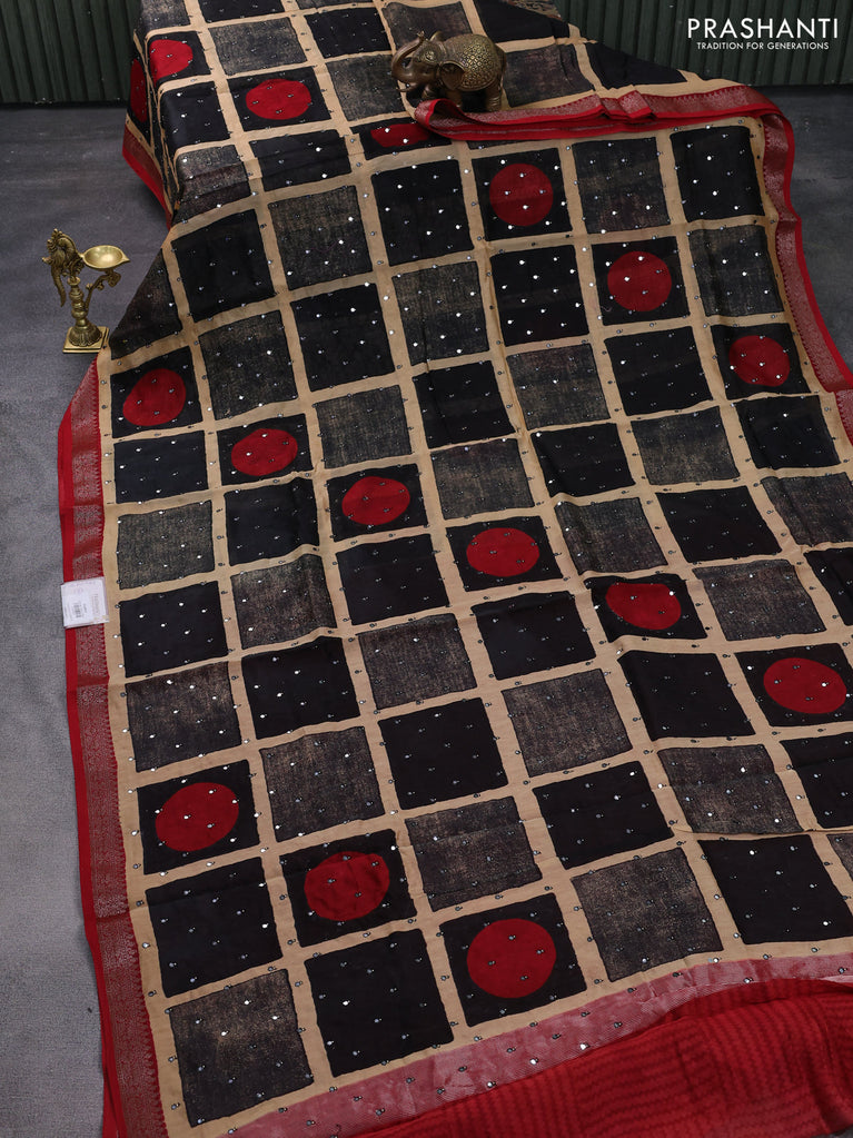Chanderi silk cotton saree black sandal and kumkum red with allover geometric prints & mirror work and woven border