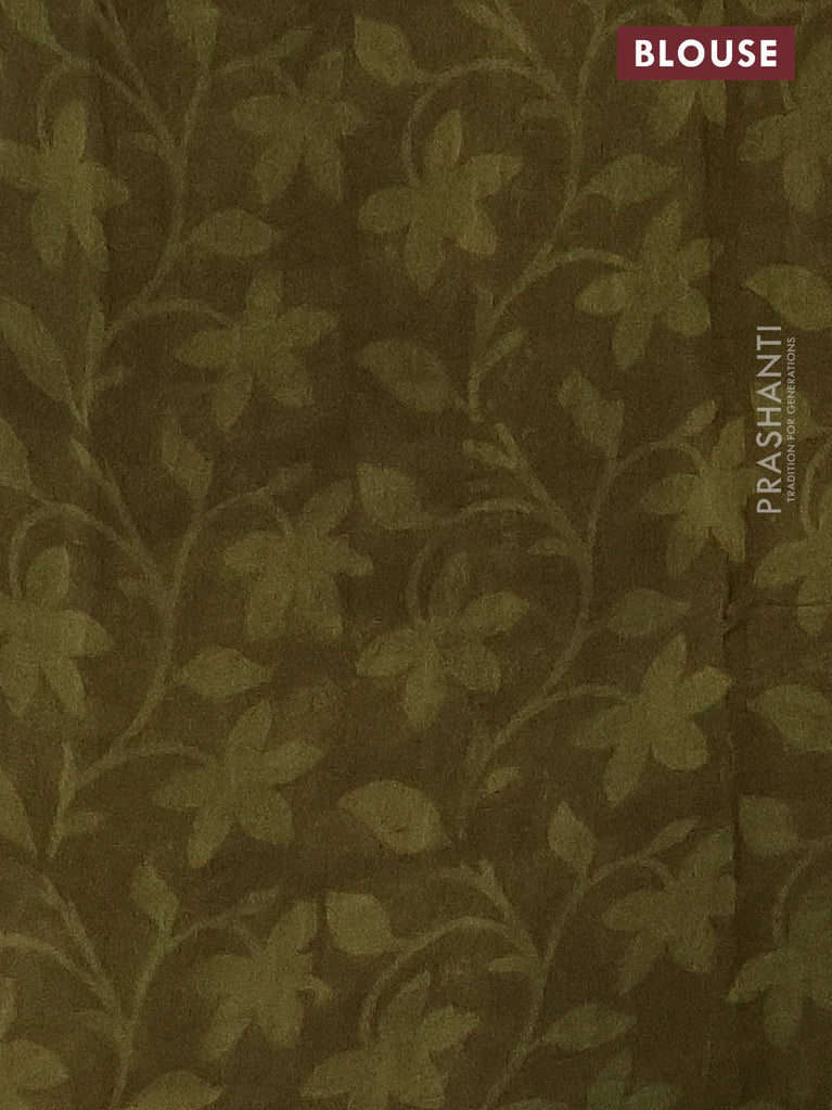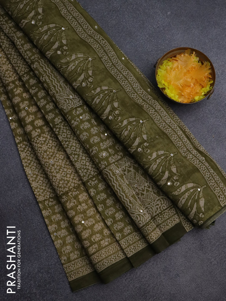 Chanderi silk cotton saree mehendi green and beige with allover prints & mirror work and printed border