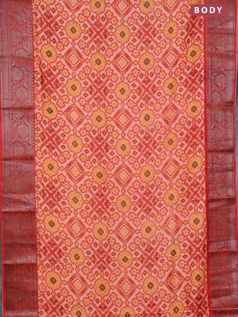Chanderi silk cotton saree pale orange and red shade with allover ikat prints and banarsi style border