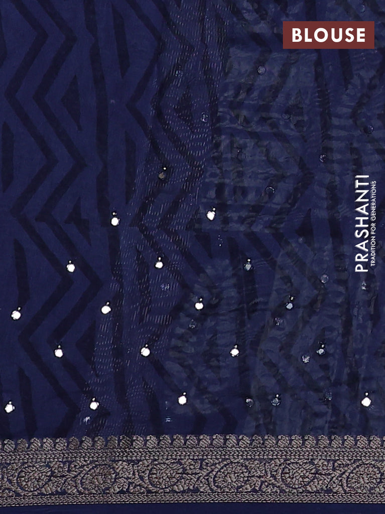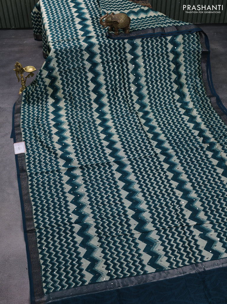 Chanderi silk cotton saree peacock blue with allover prints & mirror work and woven border