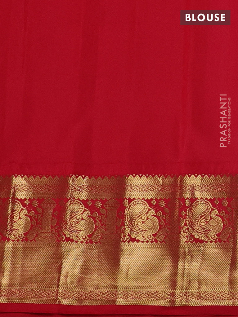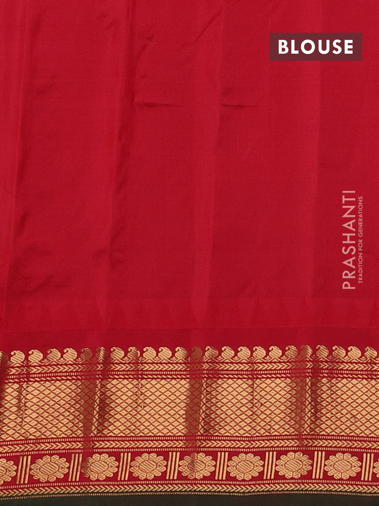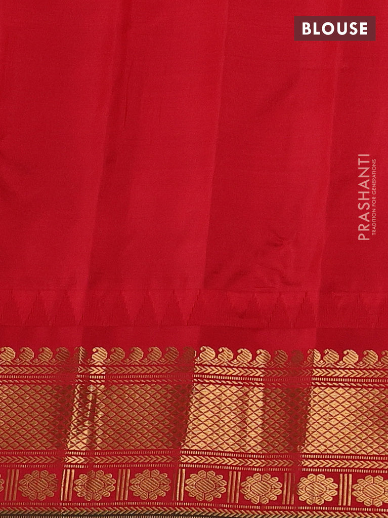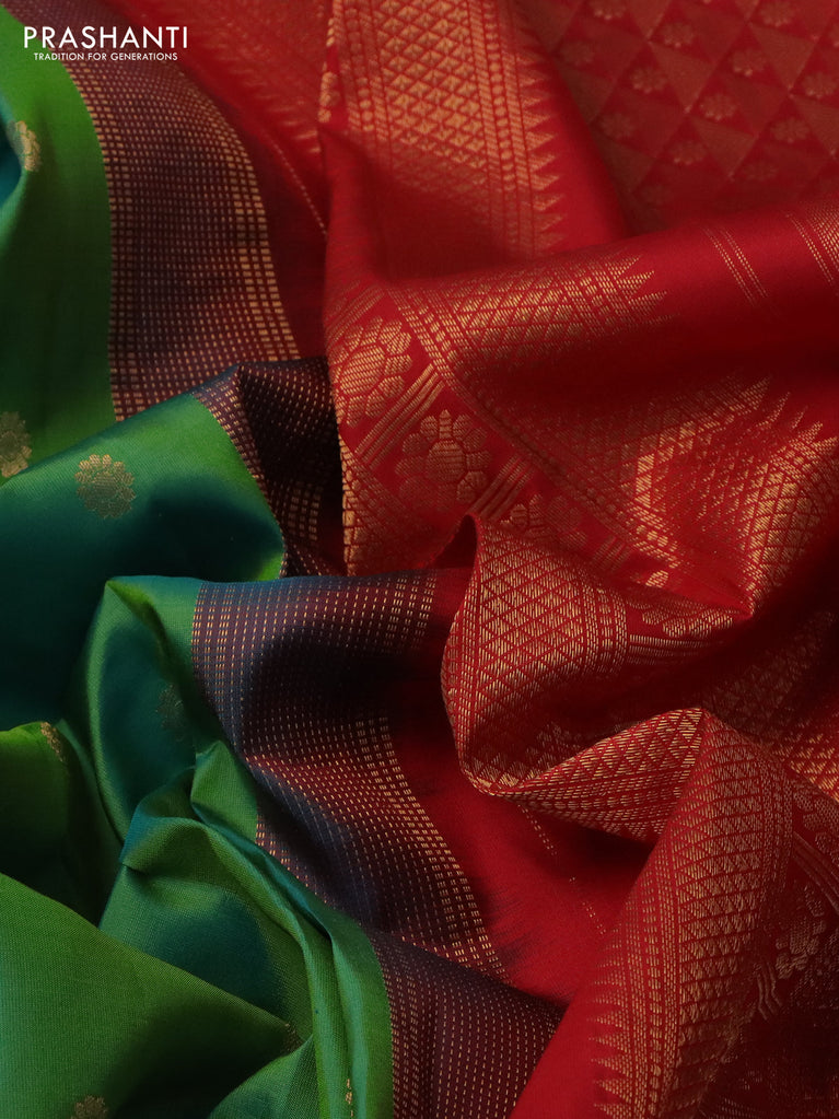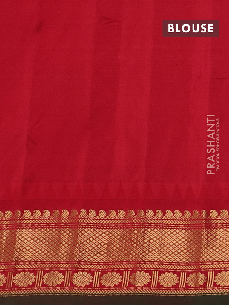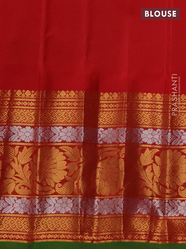 Pure gadwal silk saree dual shade of green and red with floral zari woven buttas and temple design zari woven border