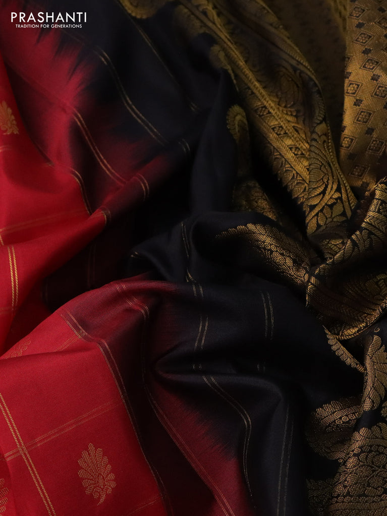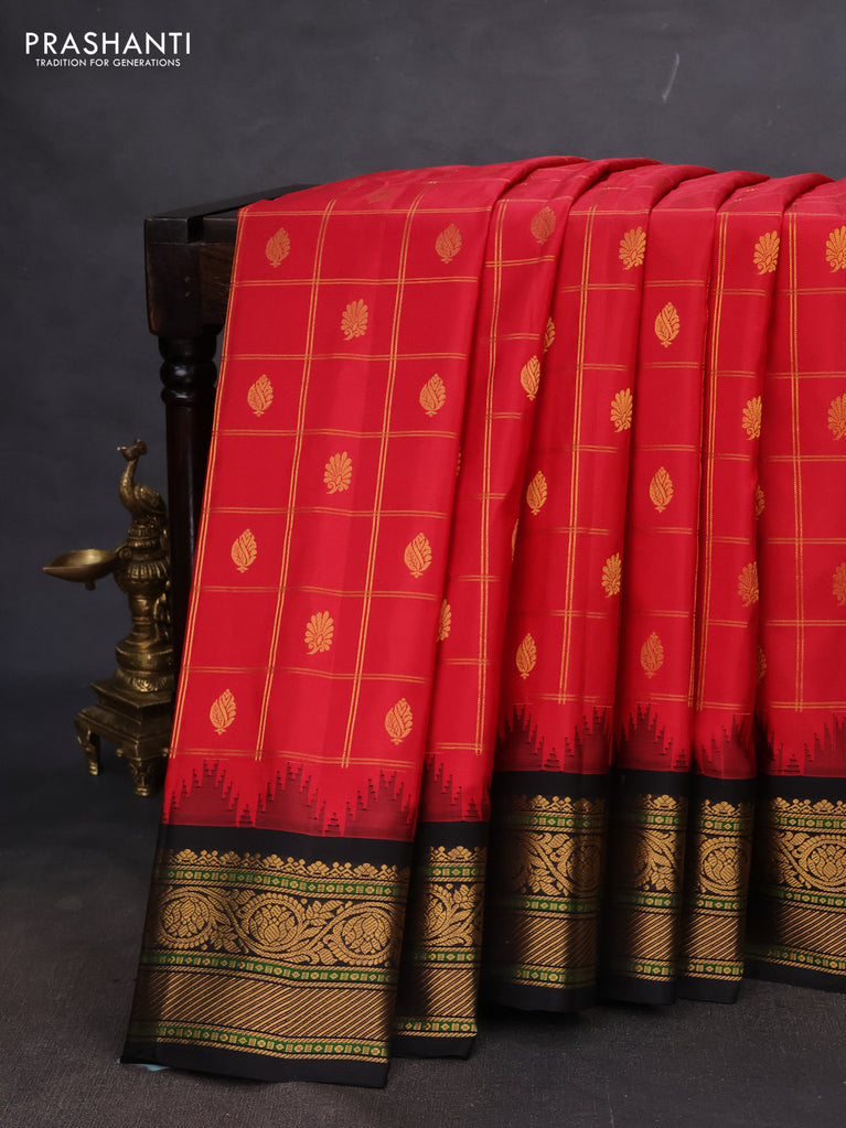 Pure gadwal silk saree kumkum red and black with allover zari checks & buttas and temple design zari woven korvai border