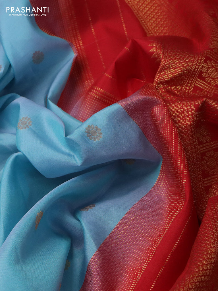 Pure gadwal silk saree light blue and red with floral zari woven buttas and temple design zari woven border