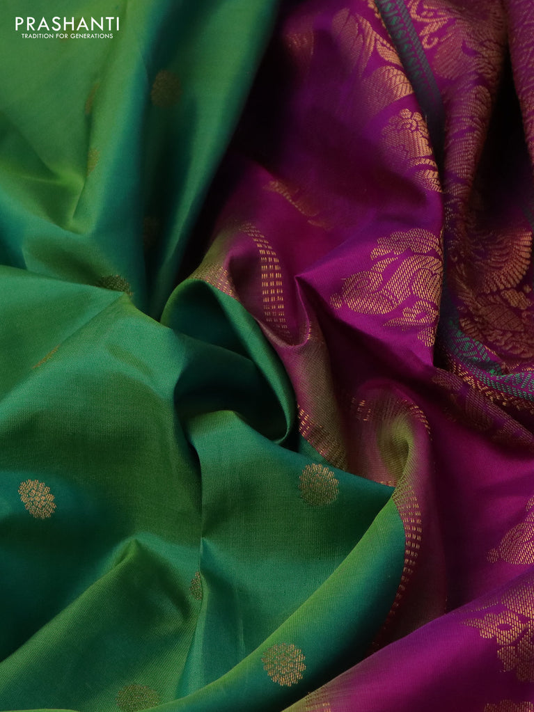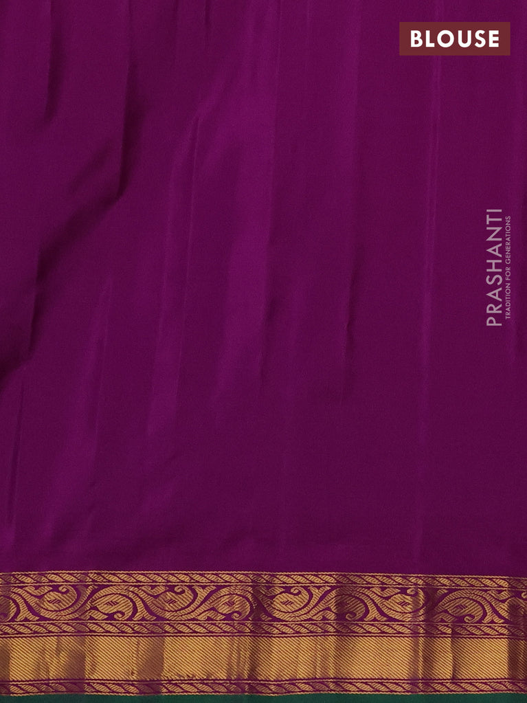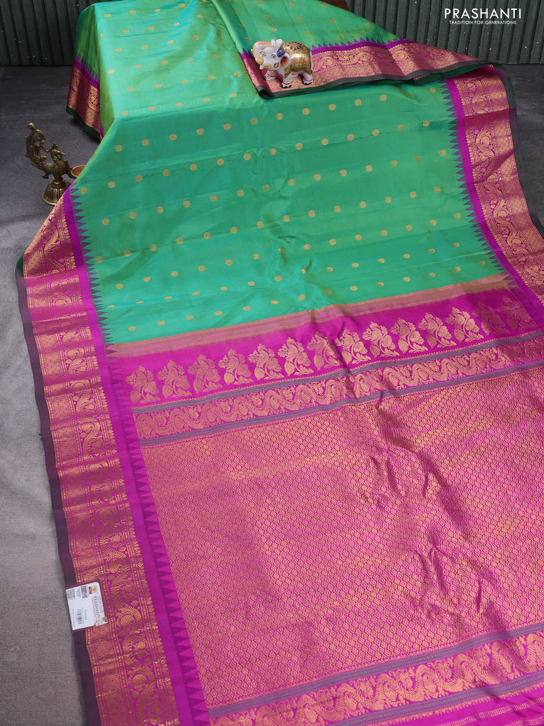 Pure gadwal silk saree green and purple with allover zari woven buttas and temple design zari woven border