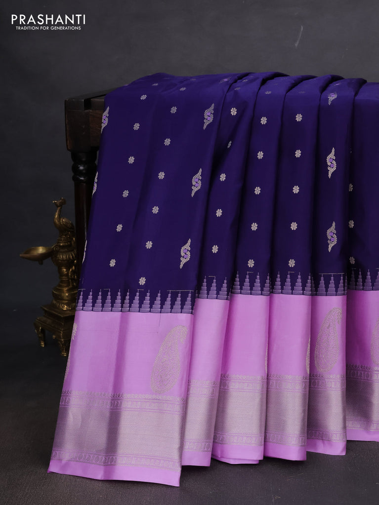 Pure gadwal silk saree navy bluw and lavender with silver zari woven buttas and long temple design silver zari woven border