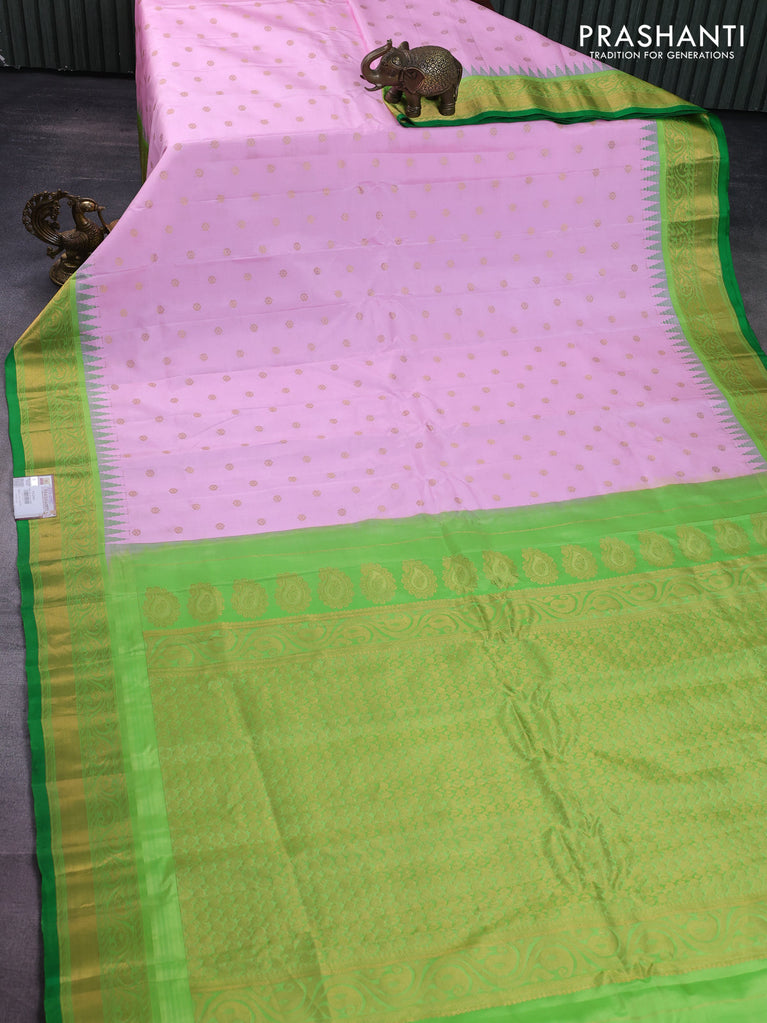 Pure gadwal silk saree light pink and green with floral zari woven buttas and temple design zari woven border