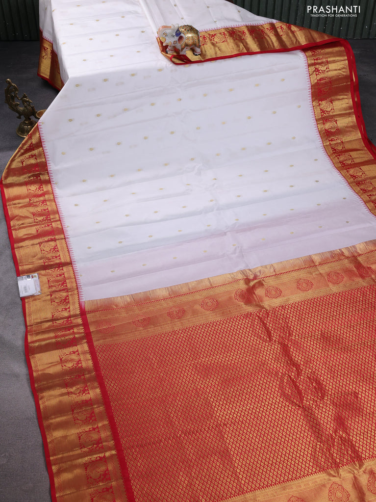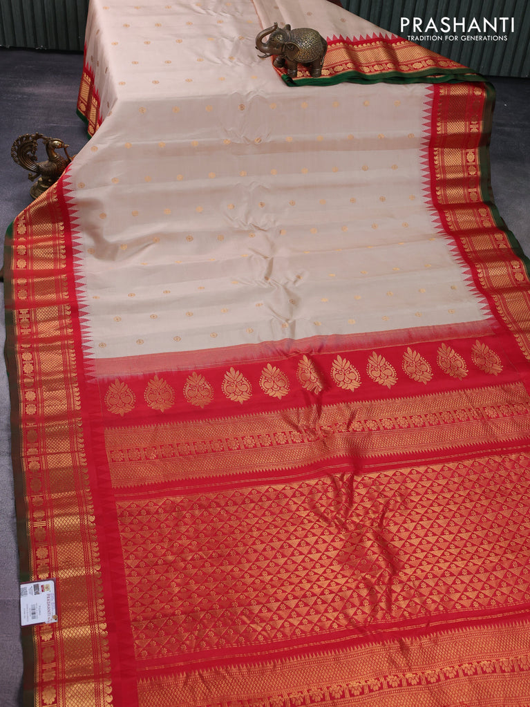 Pure gadwal silk saree off white and red with zari woven buttas and temple design zari woven border