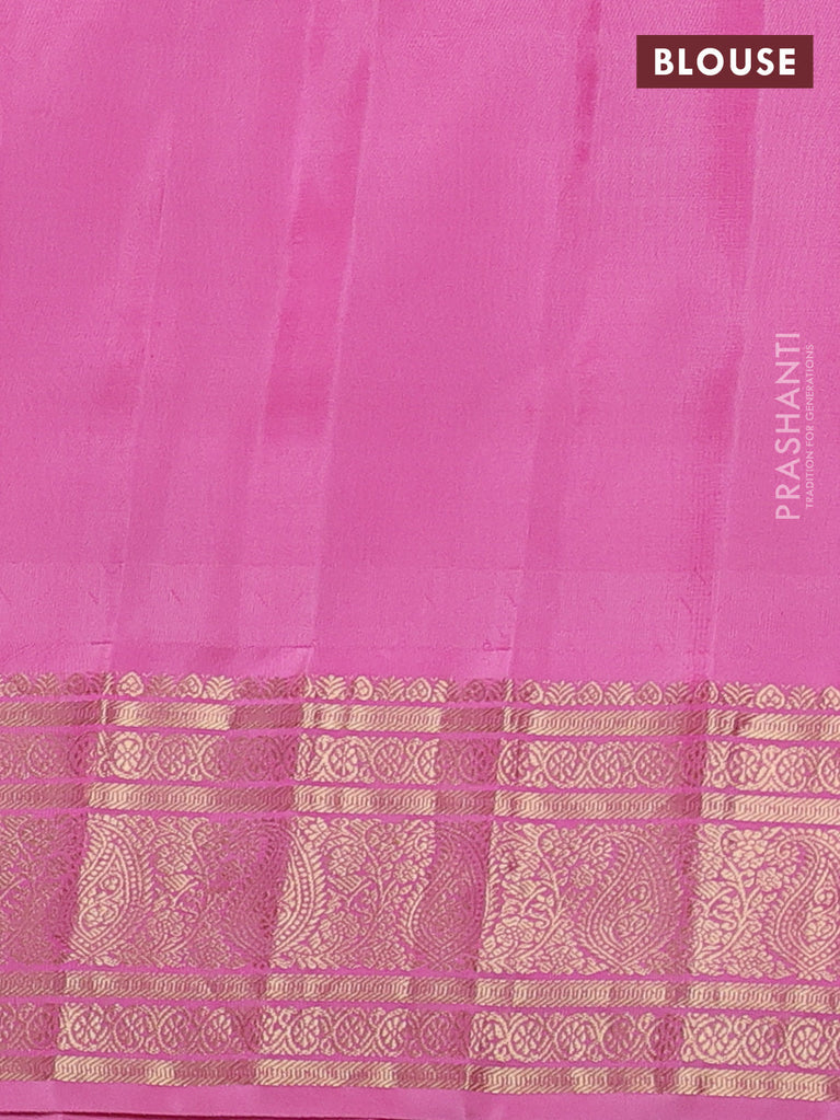 Pure gadwal silk saree dual shade of bluish green and light pink with paisley zari woven buttas and temple design zari woven border